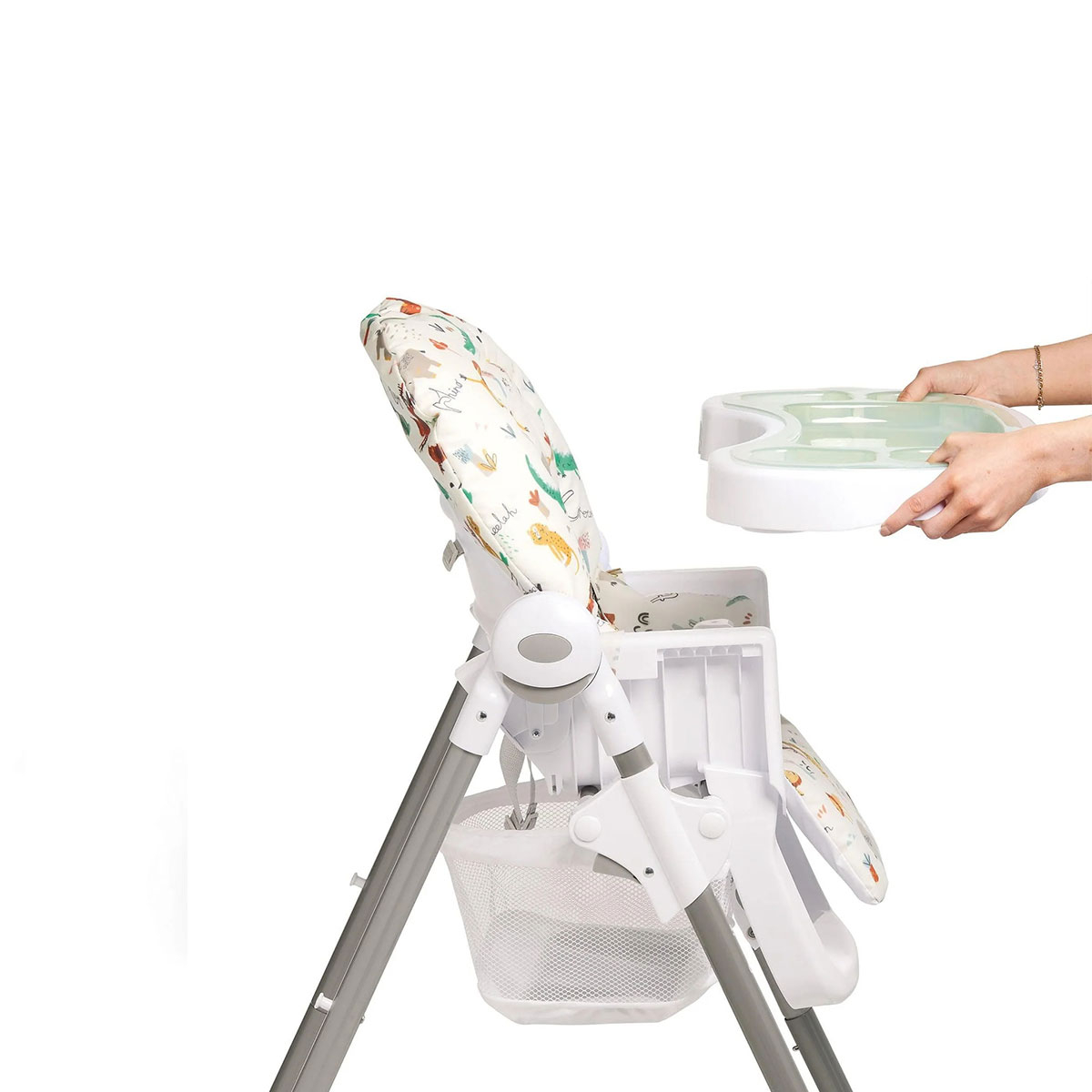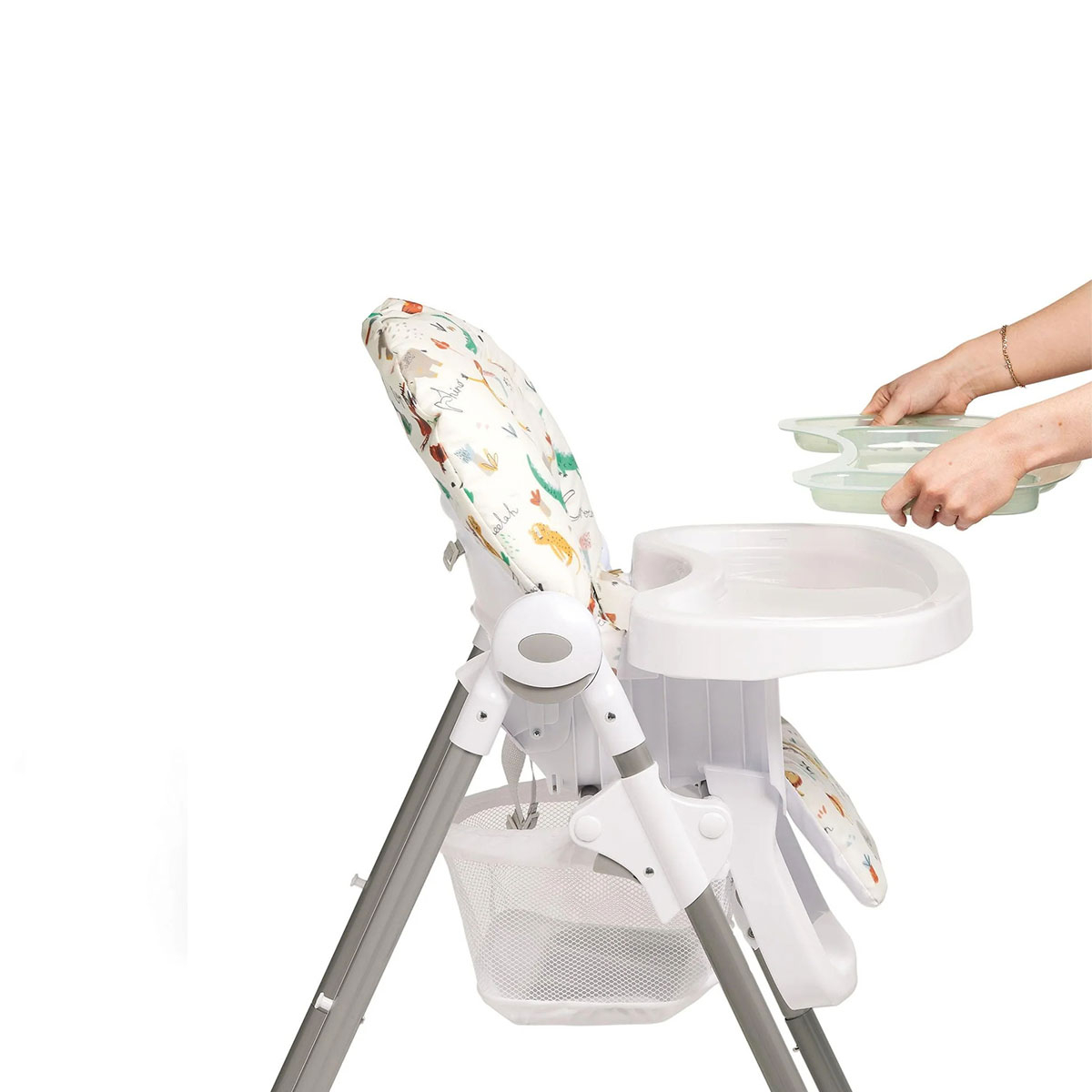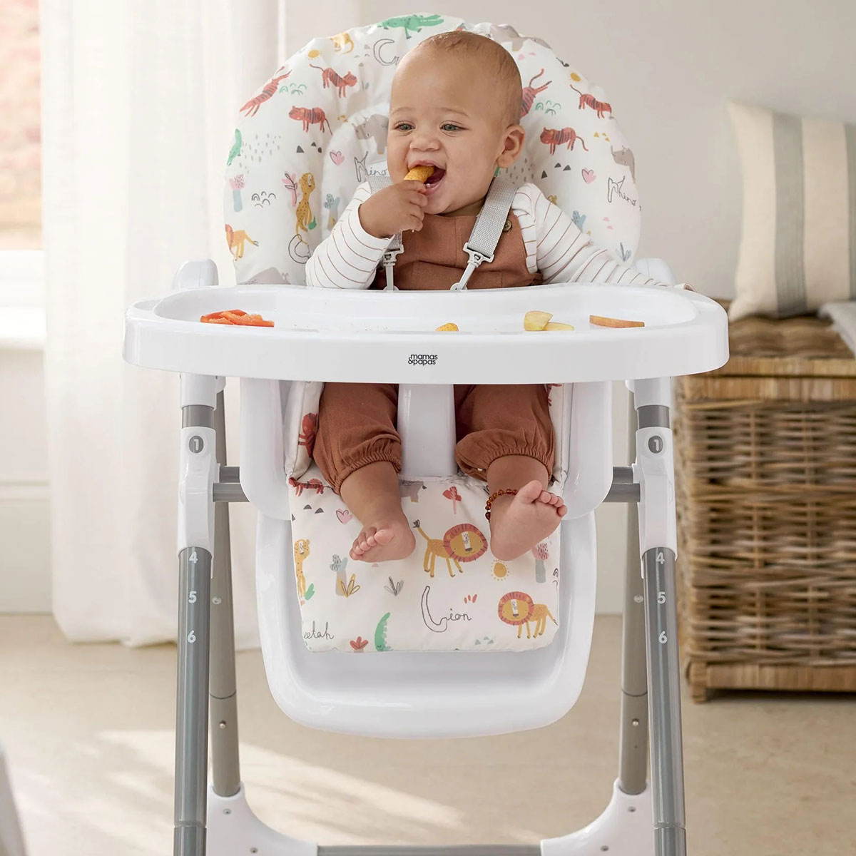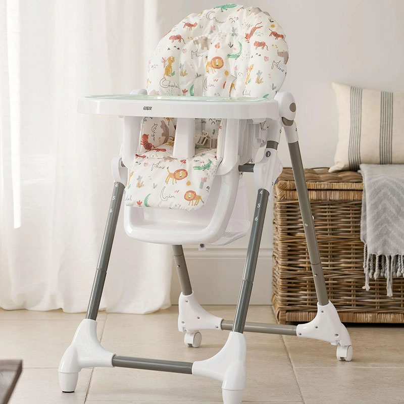 Καρέκλα φαγητού της εταιρείας Mamas & Papas σε λευκό χρώμα με πολύχρωμο σχέδιο με ζωάκια. Ιδανικό καρεκλάκι για τα πρώτα γεύματα του μωρού σας. Διαθέτει μια ποικιλία ρυθμίσεων, συμπεριλαμβανομένων έξι ρυθμίσεων ύψους, 3 θέσεων ανάκλισης και 3 ρυθμίσεων δίσκου. Έχει άνετο επενδεδυμένο κάθισμα. Είναι ιδανικό καρεκλάκι για εξοικονόμηση χώρου καθώς μπορεί να διπλωθεί συμπαγής με το δίσκο να είναι ακόμα συνδεδεμένο. Περιλαμβάνει κλειδωμένους τροχούς. Η ζώνη πέντε σημείων κρατά το μικρό σας ασφαλές ανά πάσα στιγμή. Κατασκευασμένη κάτω από το πρότυπα ασφαλείας EN14988.