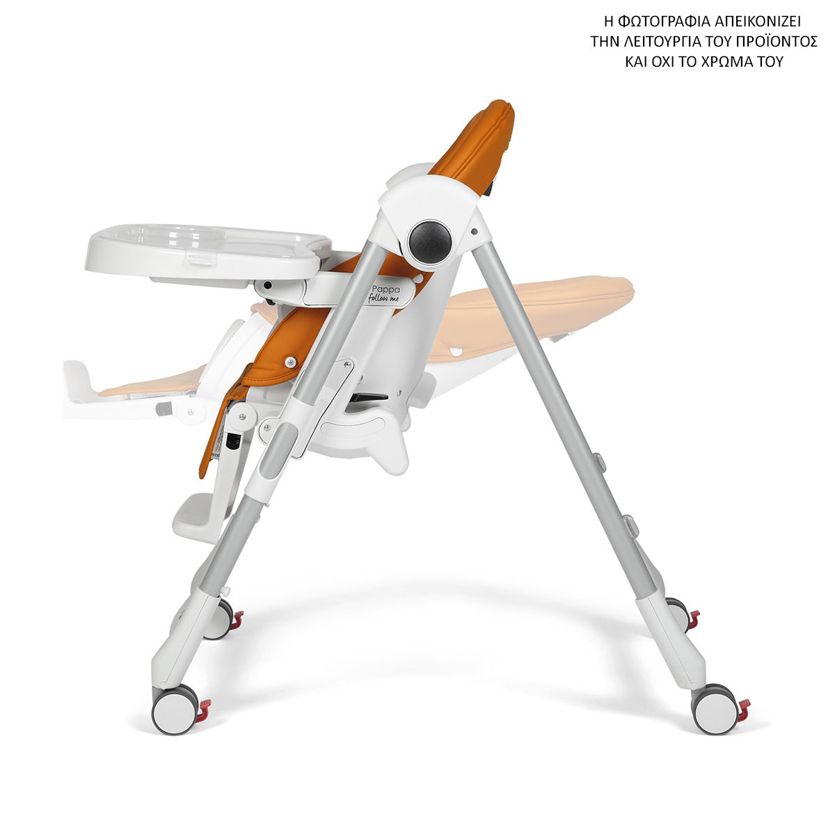 Καρέκλα φαγητού Prima Pappa Follow Me από την εταιρεία Peg Perego. Είναι εγκεκριμένη για χρήση από την γέννηση καθώς η πλάτη διαθέτει δυνατότητα ανάκλισης 5 θέσεων. Στην οριζόντια θέση μπορεί να χρησιμοποιηθεί και ως ρηλάξ όπου το μωρό σας χαλαρώνει και ξεκουράζεται. Το ύψος του καθίσματος μπορεί να ρυθμιστεί σε 7 θέσεις και το υποπόδιο σε 3 θέσεις. Ο σκελετός του είναι κατασκευασμένος από μέταλλο και πλαστικό υλικό υψηλής ποιότητας. Διαθέτει αφαιρούμενο κάλυμμα καθίσματος από nanotechnology ύφασμα σε πράσινη απόχρωση. Το πρωτοποριακό nanotechnology ύφασμα είναι απαλό, «αναπνέει» και προσομοιάζει την υφή των βαμβακερών υφασμάτων. Είναι ιδιαιτέρα ανθεκτικό στους λεκέδες και καθαρίζεται εύκολα και γρήγορα με υγρό πανί. Έχει 4 ρόδες με φρένα που διευκολύνουν την εύκολη μετακίνηση μέσα στους χώρους του σπιτιού. Οι τροχοί διαθέτουν μαλακό καουτσούκ ώστε να μην χαράζουν, σε οποιαδήποτε επιφάνεια όπως μάρμαρο, τσιμεντοκονία ή ξύλινο πάτωμα. Ο διπλός δίσκος μπορεί να αφαιρεθεί και να τοποθετηθεί στα πίσω πόδια του καθίσματος όταν δεν χρησιμοποιείται. Το διάφανο κάλυμμα του δίσκου πλένεται στο πλυντήριο πιάτων κι έτσι διατηρείται πάντα καθαρό. Οι ζώνες ασφαλείας 5 σημείων και το ειδικό ανατομικό stop συγκρατούν το παιδί προσφέροντας απόλυτη ασφάλεια. Η καρέκλα μπορεί να αναδιπλωθεί πιέζοντας το ειδικό κουμπί και να σταθεί όρθια, καταλαμβάνοντας μικρό χώρο και διασφαλίζοντας εύκολη αποθήκευση. Το Prima Pappa Follow Me είναι πρακτικό, λειτουργικό και ακολουθεί την ανάπτυξη του παιδιού σε κάθε ηλικία: 1. από την γέννηση μέχρι 6 μηνών ξεκουράζει το μωρό σαν ρηλάξ, 2. από 6 μηνών λειτουργεί σαν κάθισμα για φαγητό ή παιχνίδι, 3. από 12 μηνών και μετά, αφαιρείτε τον δίσκο για να κάθεται μαζί σας το παιδί στο τραπέζι. Είναι ελαφρύ με βάρος 7,6Kg, με πρακτικές διαστάσεις που το καθιστούν ιδανικό για κάθε χώρο. Διαστάσεις (κλειστή): 55εκ.Μ x 30εκ.Π x 95.5εκ.Υ. Διαστάσεις (ανοικτή): 55εκ.Μ x 75.5εκ.Π x 104.5εκ.Υ. Ιταλικής κατασκευής. Φέρει 2 χρόνια εγγύηση ορθή χρήσης. Το προϊόν πληροί τις ευρωπαϊκές προδιαγραφές ως προς την ασφάλεια και την προστασία της υγείας.