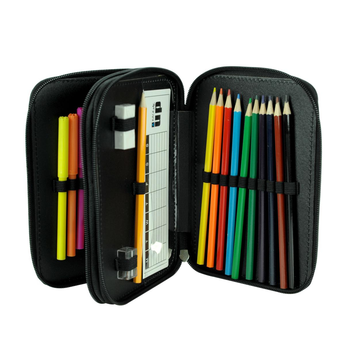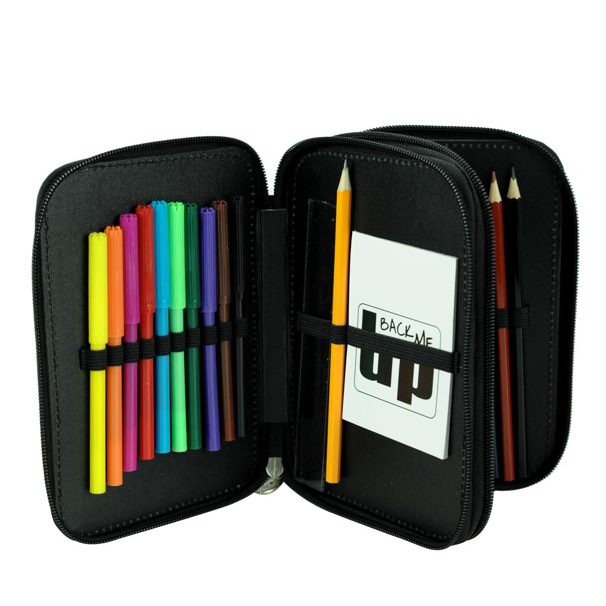 Κασετίνα από την εταιρεία Back Me Up σε μπλε-μαύρο χρώμα με μοντέρνο σχέδιο. Έχει 2 θήκες που κλείνουν με φερμουάρ. Η κασετίνα περιλαμβάνει στυλό, μολύβι, γόμα, ξύστρα, χάρακα, ξυλομπογιές, μαρκαδόρους, μπλοκάκι και πρόγραμμα. Όμορφη και πρακτική κασετίνα, ιδανική για να συνοδεύει καθημερινά το παιδί στο σχολείο.