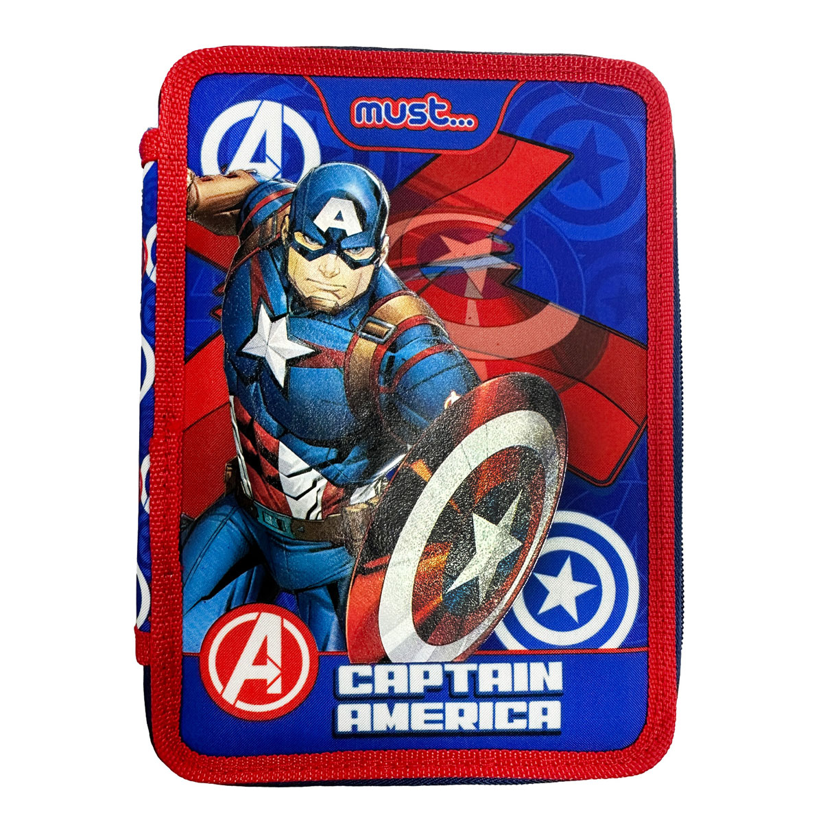 Κασετίνα από την εταιρεία Must σε μπλε χρώμα με κόκκινες λεπτομέρειες και σχέδιο με τον ήρωα της Marvel Captain America. Είναι κατασκευασμένη από πολυεστέρα. Έχει 2 θήκες που κλείνουν με φερμουάρ. Η κασετίνα περιλαμβάνει 1 στυλό, 1 μολύβι, 1 γόμα, 1 ξύστρα, 1 χάρακα, ξυλομπογιές και μαρκαδόρους. Όμορφη και πρακτική κασετίνα, ιδανική για να συνοδεύει καθημερινά το παιδί στο σχολείο.
