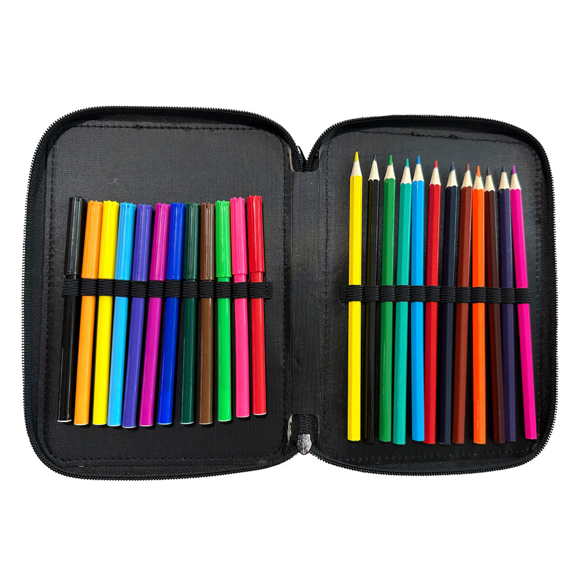 Κασετίνα από την εταιρεία Must σε μαύρο χρώμα με πολύχρωμες λεπτομέρειες και μοντέρνο σχέδιο. Είναι κατασκευασμένη από πολυεστέρα. Έχει 2 θήκες που κλείνουν με φερμουάρ. Η κασετίνα περιλαμβάνει 1 στυλό, 1 μολύβι, 1 γόμα, 1 ξύστρα, 1 χάρακα, ξυλομπογιές και μαρκαδόρους. Όμορφη και πρακτική κασετίνα, ιδανική για να συνοδεύει καθημερινά το παιδί στο σχολείο.