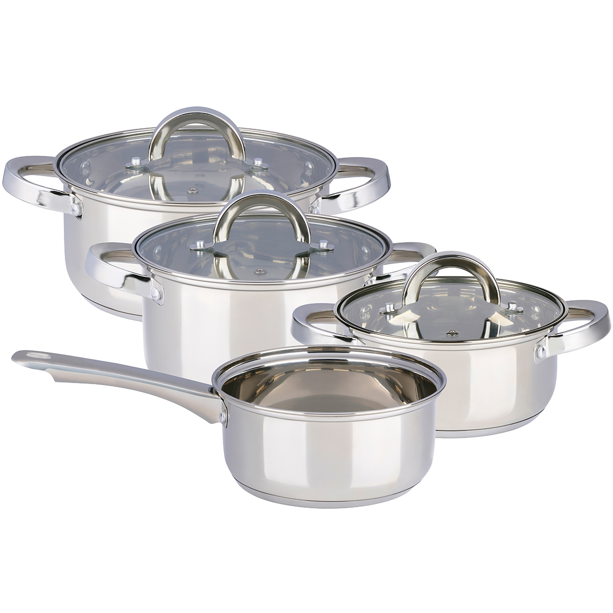 Κατσαρόλες σε σετ από την εταιρεία Alpina. Το σετ περιλαμβάνει 1 γαλατιέρα, 1 κατσαρολάκι, 2 κατσαρόλες και 3 καπάκια που έχουν διαφορετικά μεγέθη και χωρητικότητες. Είναι κατασκευασμένες από ανοξείδωτο ατσάλι το οποίο είναι ανθεκτικό στη διάβρωση και πολύ στιβαρό. Διαθέτουν λαβές για εύκολη μεταφορά. Τα καπάκια είναι κατασκευασμένα από διάφανο γυάλινο και σας δίνουν τη δυνατότητα να βλέπετε μέσα στην κατσαρόλα κατά τη διαδικασία μαγειρέματος. Διαθέτουν οπή που επιτρέπει τη διαφυγή του ατμού. Η βάση στις κατσαρόλες είναι ανοξείδωτη με πάχος 1mm. Κατάλληλες για όλες τις εστίες συμπεριλαμβανομένης της επαγωγικής.