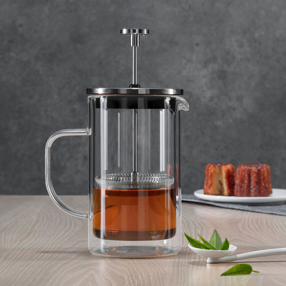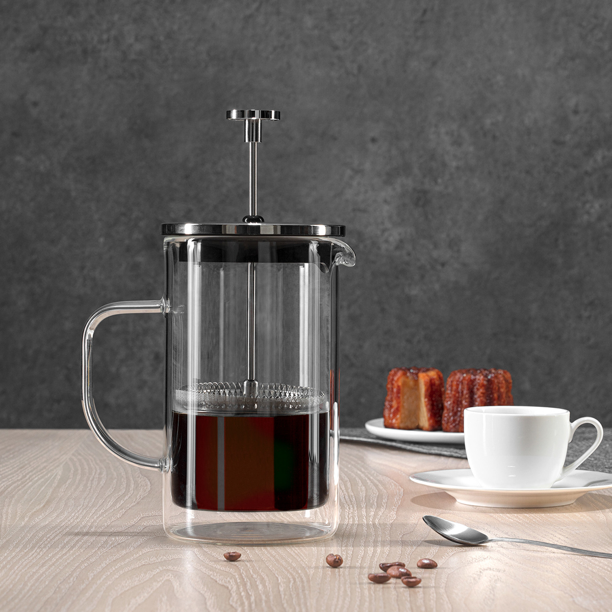 Καφετιέρα χειρός κατασκευασμένη από διάφανο γυαλί με μαύρες πλαστικές και ασημί ανοξείδωτες λεπτομέρειες. Λειτουργεί με έμβολο και έτσι δεν χρειάζεται να χρησιμοποιήσετε φίλτρα. Διαθέτει διπλό τοίχωμα που διατηρεί τον καφέ ζεστό και αποτρέπει τα εγκαύματα στα δάχτυλα. Ιδανικό εργαλείο για να φτιάξετε τον αγαπημένο σας καφέ γρήγορα, εύκολα και χωρίς ρεύμα. Χωρητικότητα: 600ml.
