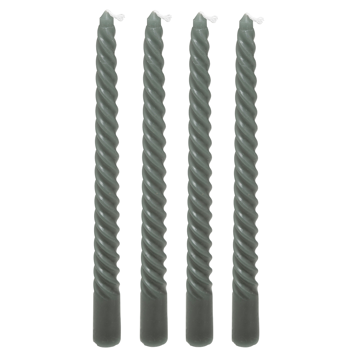Κεριά κηροπηγίου σε σετ, για να δημιουργήσετε μια κομψή και φιλόξενη ατμόσφαιρα. Το σετ περιλαμβάνει 4 κεριά κατασκευασμένα από παραφίνη σε χακί χρώμα με στριφογυριστό σχέδιο. Ιδανικά για κάθε είδους διακόσμηση, που θα προσφέρουν μια ζεστή και φωτεινή αίσθηση στον χώρο σας προσδίδοντας μία αίσθηση χαράς και ζωντάνιας. Διάρκεια καύσης: 5 ώρες.