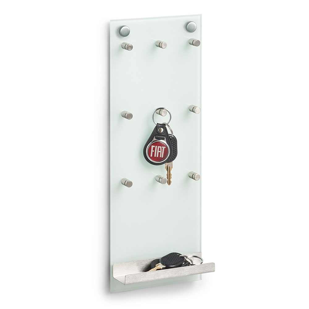Κλειδοθήκη τοίχου με ραφάκι κατασκευασμένη από διάφανο γυαλί. Τα 9 ασημένια άγκιστρα από ανοξείδωτο ατσάλι που διαθέτει είναι εξοπλισμένα με μαύρο δακτύλιο από καουτσούκ, έτσι ώστε κάθε κλειδί σας να έχει το βέλτιστο κράτημα. Στο κάτω μέρος διαθέτει ραφάκια που μπορείτε να αποθηκεύσετε με ασφάλεια μικρά αντικείμενα. Ιδανική για τοποθέτηση στην είσοδο του σπιτιού ή του γραφείου. Θα σας γλιτώσει από το χρονοβόρο ψάξιμο των κλειδιών σας.