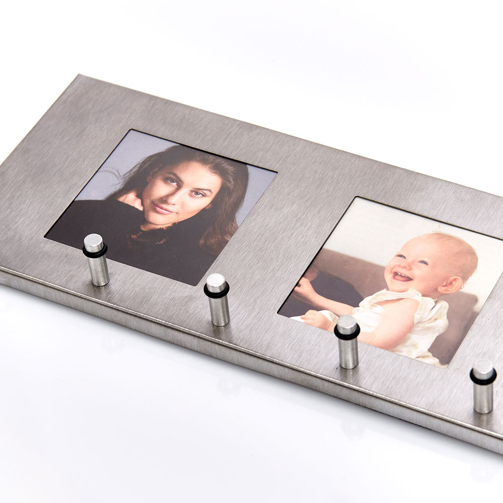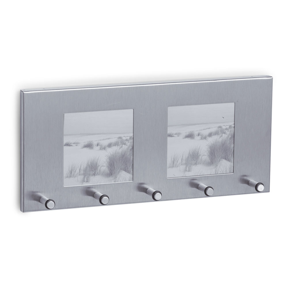 Κλειδοθήκη τοίχου με 2 θέσεις φωτογραφιών, κατασκευασμένη από ανοξείδωτο ατσάλι σε ασημί χρώμα. Τα 5 άγκιστρα είναι εξοπλισμένα με έναν μαύρο δακτύλιο από καουτσούκ, έτσι ώστε κάθε κλειδί σας να έχει το βέλτιστο κράτημα. Δώστε στη κλειδοθήκη τη προσωπική σας πινελιά και συμπληρώστε τη με 2 φωτογραφίες της επιλογής σας (8x8). Ιδανική για τοποθέτηση στην είσοδο του σπιτιού ή του γραφείου. Θα σας γλιτώσει από το χρονοβόρο ψάξιμο των κλειδιών σας.