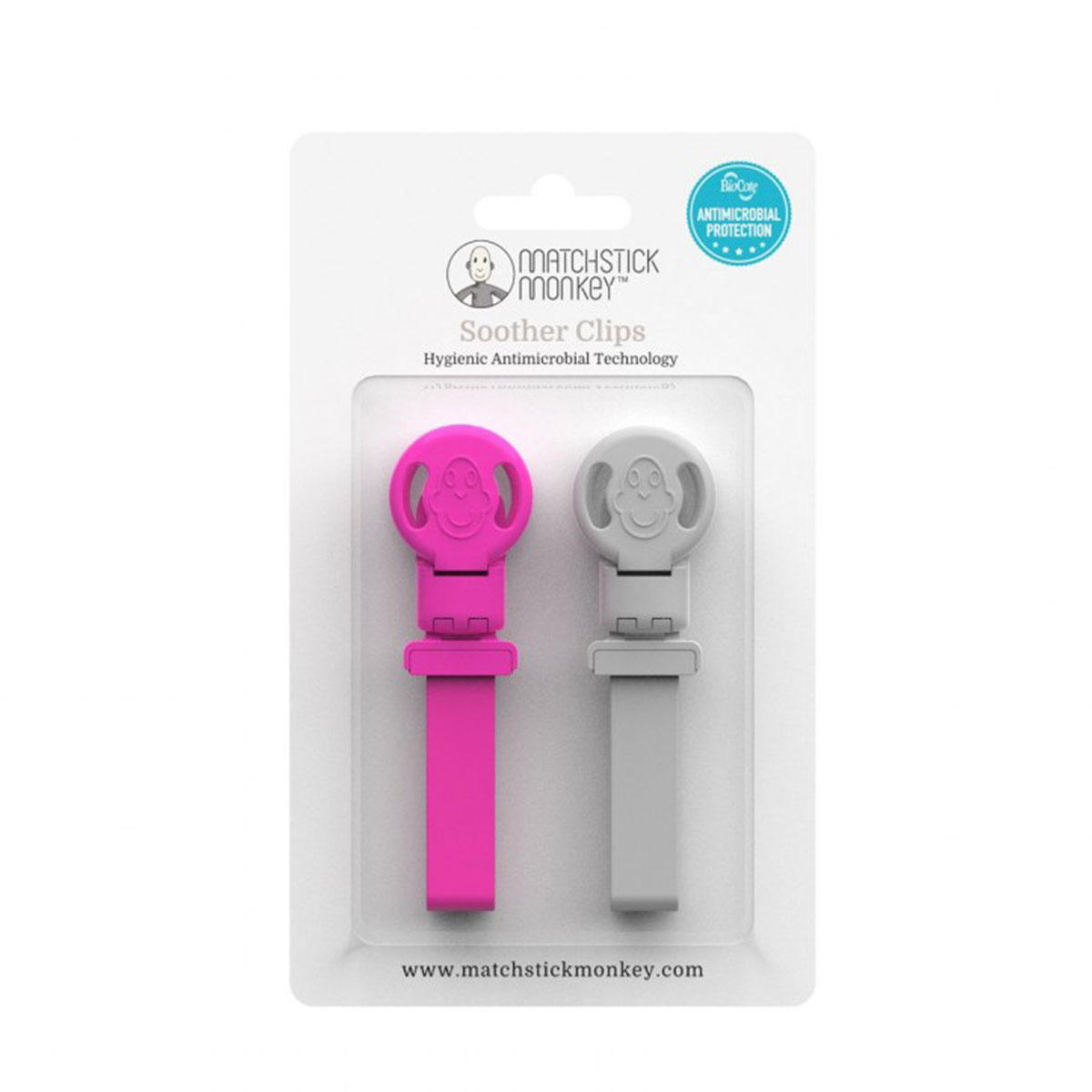 Σετ κλιπ πιπίλας και μασητικού σε φούξια και γκρι χρώμα της εταιρείας Matchstick Monkey. Ιδανικά για να κρατήσουν τις πιπίλες και τα μασητικά κοντά στο μωρό και μακριά από το πάτωμα. Είναι κατασκευασμένα από σιλικόνη κατάλληλη για τρόφιμα εγκεκριμένη από τον FDA, χωρίς ΒPA και τοξικά, φιλικά προς το περιβάλλον. Διαθέτουν την αντιμικροβιακή τεχνολογία BioCote®, που τα βοηθάει να παραμένουν υγιεινά και καθαρά. Στο ένα άκρο διαθέτουν δακτύλιο για το μασητικό ή την πιπίλα και στο άλλο το κλιπ για στερεωθούν εύκολα και γρήγορα στο ρούχο του μωρού σας. Μπορούν να πλυθούν στο πλυντήριο πιάτων.