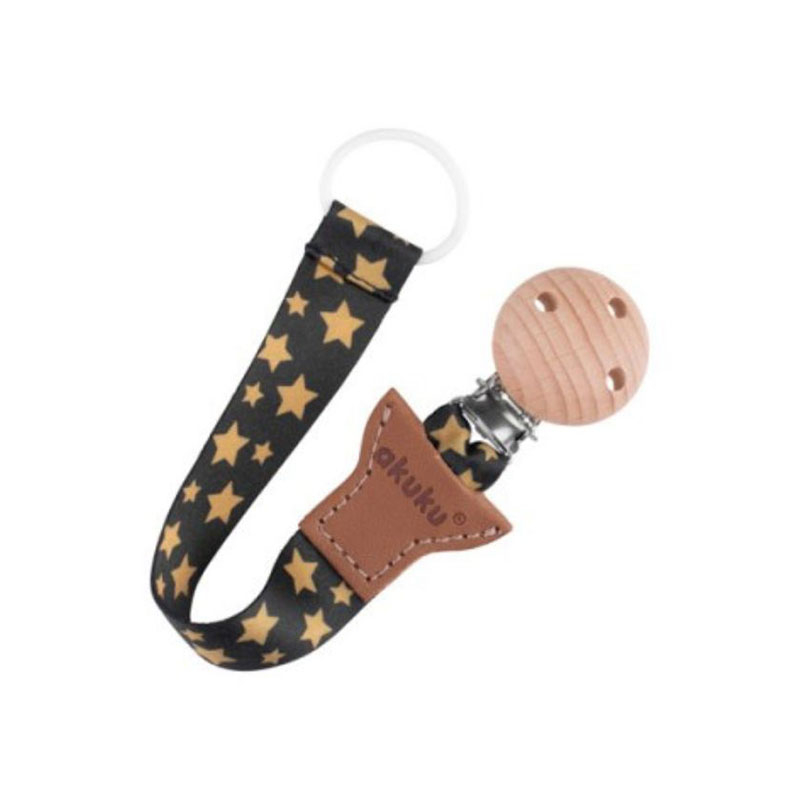 Κλιπ πιπίλας από την εταιρεία Akukuσε ανθρακί χρώμα με χρυσές λεπτομέρειες και σχέδιο με αστεράκια. Έχει ανθεκτική κορδέλα, σχεδιασμένη για την ασφάλεια και την προστασία του παιδιού. Διαθέτει κατάλληλο κούμπωμα σε μορφή ξύλινου κλιπ. Εύκολο και γρήγορο στην τοποθέτηση. Εφαρμόζει σε κάθε πιπίλα με ή χωρίς λαβή. Δεν καταστρέφει το υλικό των ρούχων. Συμμορφώνεται με το Ευρωπαϊκό πρότυπο PN EN 12586. Θα σας βοηθήσει για να είστε πάντα σίγουρες ότι το μωρό σας έχει πάντα καθαρή πιπίλα.