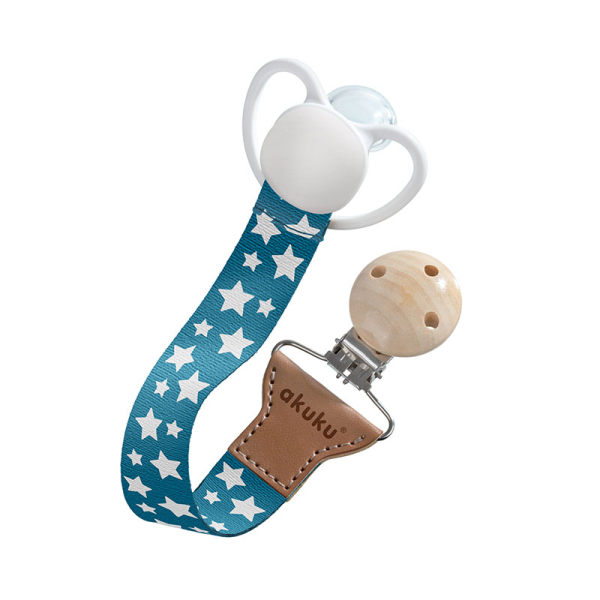 Κλιπ πιπίλας από την εταιρεία Akukuσε μπλε χρώμα με λευκές λεπτομέρειες και σχέδιο με αστεράκια. Έχει ανθεκτική κορδέλα, σχεδιασμένη για την ασφάλεια και την προστασία του παιδιού. Διαθέτει κατάλληλο κούμπωμα σε μορφή ξύλινου κλιπ. Εύκολο και γρήγορο στην τοποθέτηση. Εφαρμόζει σε κάθε πιπίλα με ή χωρίς λαβή. Δεν καταστρέφει το υλικό των ρούχων. Συμμορφώνεται με το Ευρωπαϊκό πρότυπο PN EN 12586. Θα σας βοηθήσει για να είστε πάντα σίγουρες ότι το μωρό σας έχει πάντα καθαρή πιπίλα.