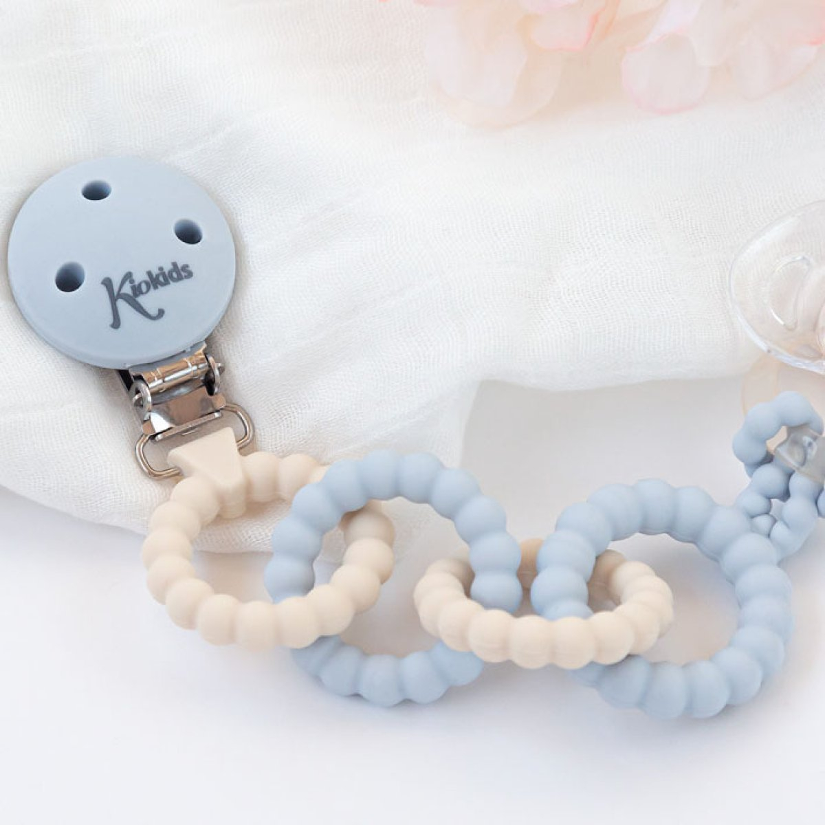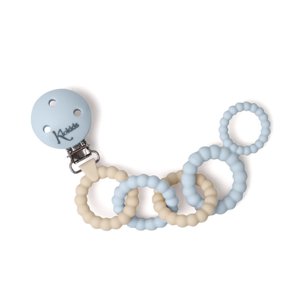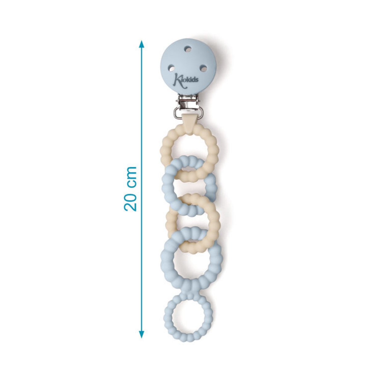 Κλιπ πιπίλας από την εταιρεία Kiokids σε γαλάζιο-εκρού χρώμα. Είναι κατασκευασμένο από σιλικόνη και ανοξείδωτο ατσάλι κατάλληλα για τρόφιμα, ένα φιλικό προς το περιβάλλον, αντιβακτηριδιακό και ανθεκτικό υλικό. Είναι ιδανικό για να διατηρείται η πιπίλα πάντα καθαρή ενώ είναι και ασφαλές αν θελήσει το μικρό σας να το μασήσει.