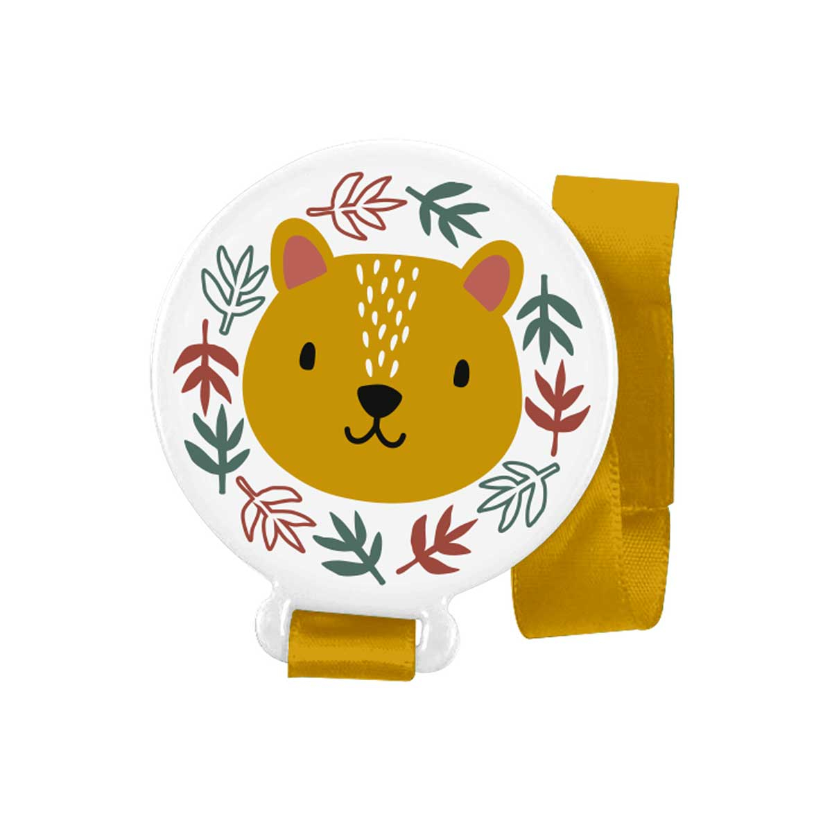 Κλιπ πιπίλας σε μουσταρδί-λευκό χρώμα και σχέδιο ζωάκι. Πιάνεται στο ρουχαλάκι του μωρού για να μην πέφτει η πιπίλα στο πάτωμα και να παραμένει καθαρή.