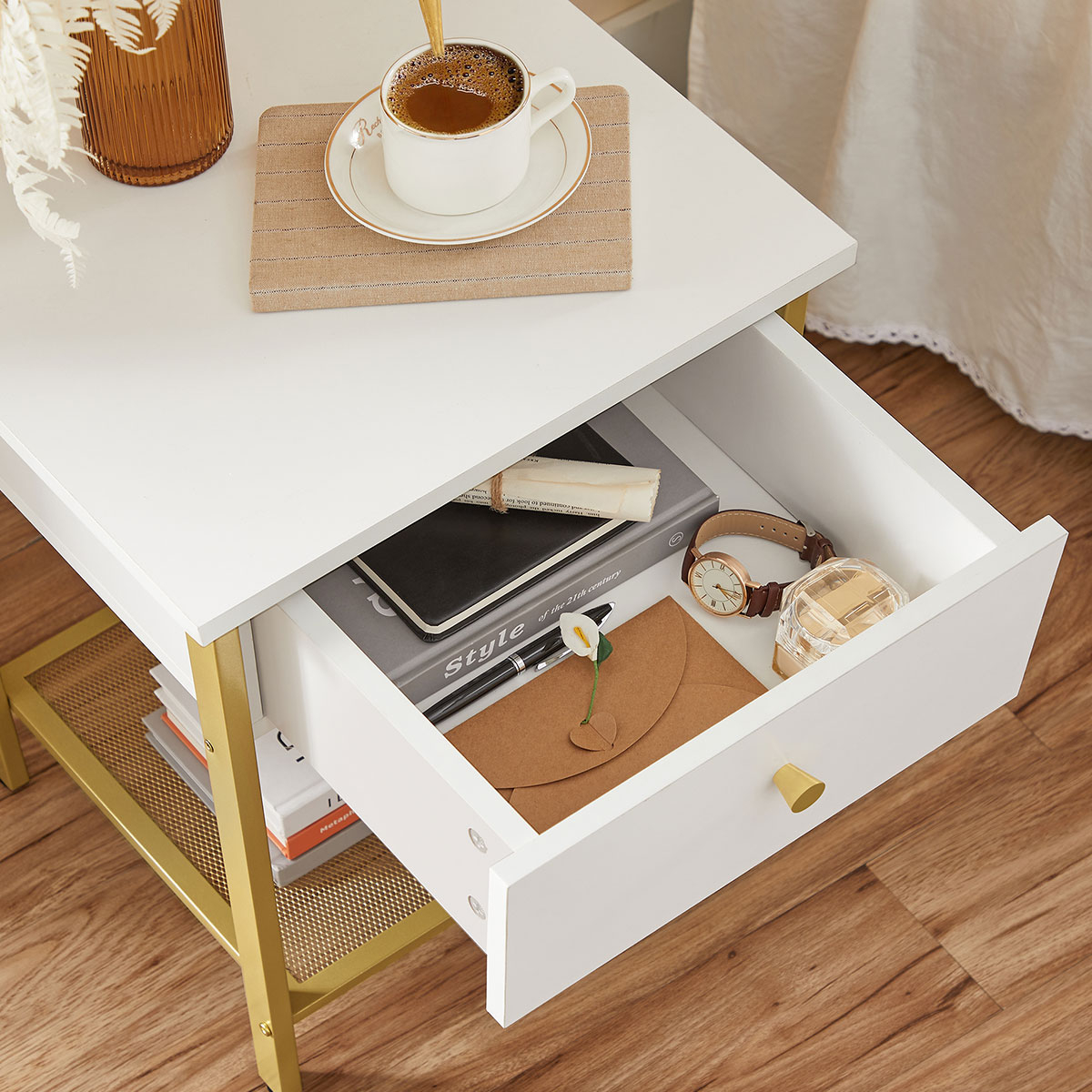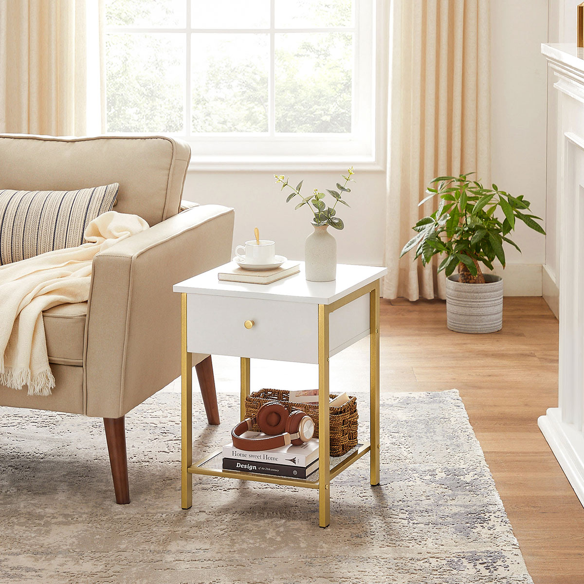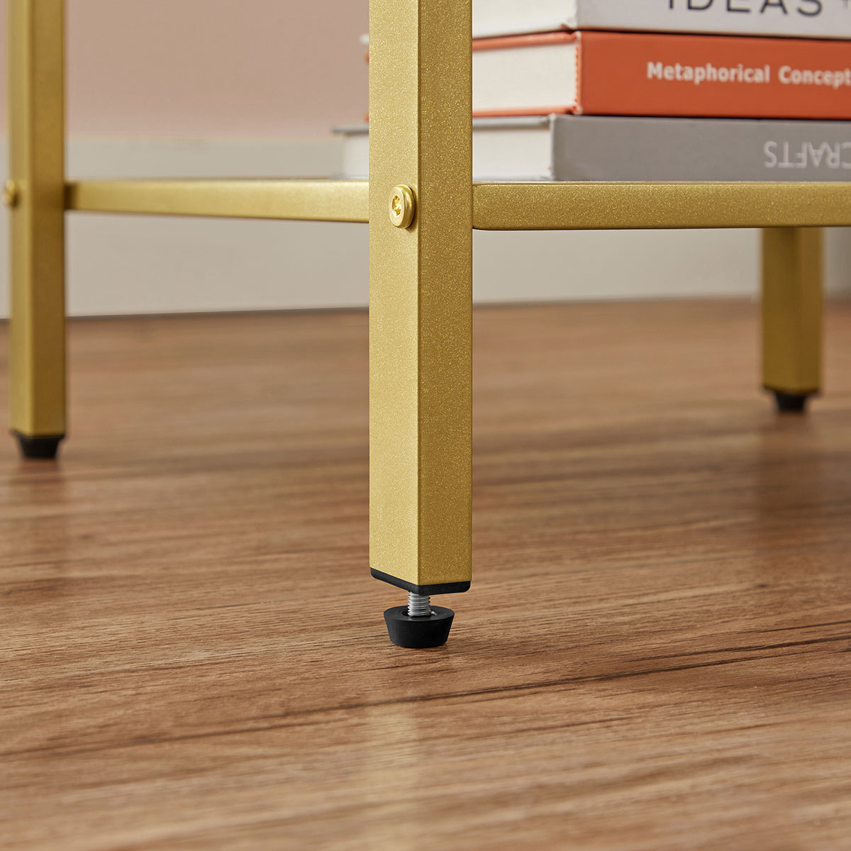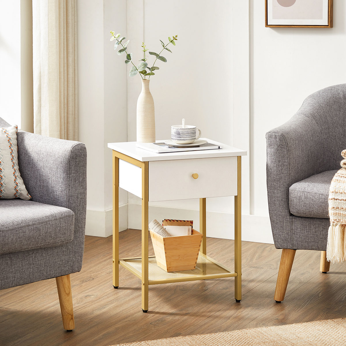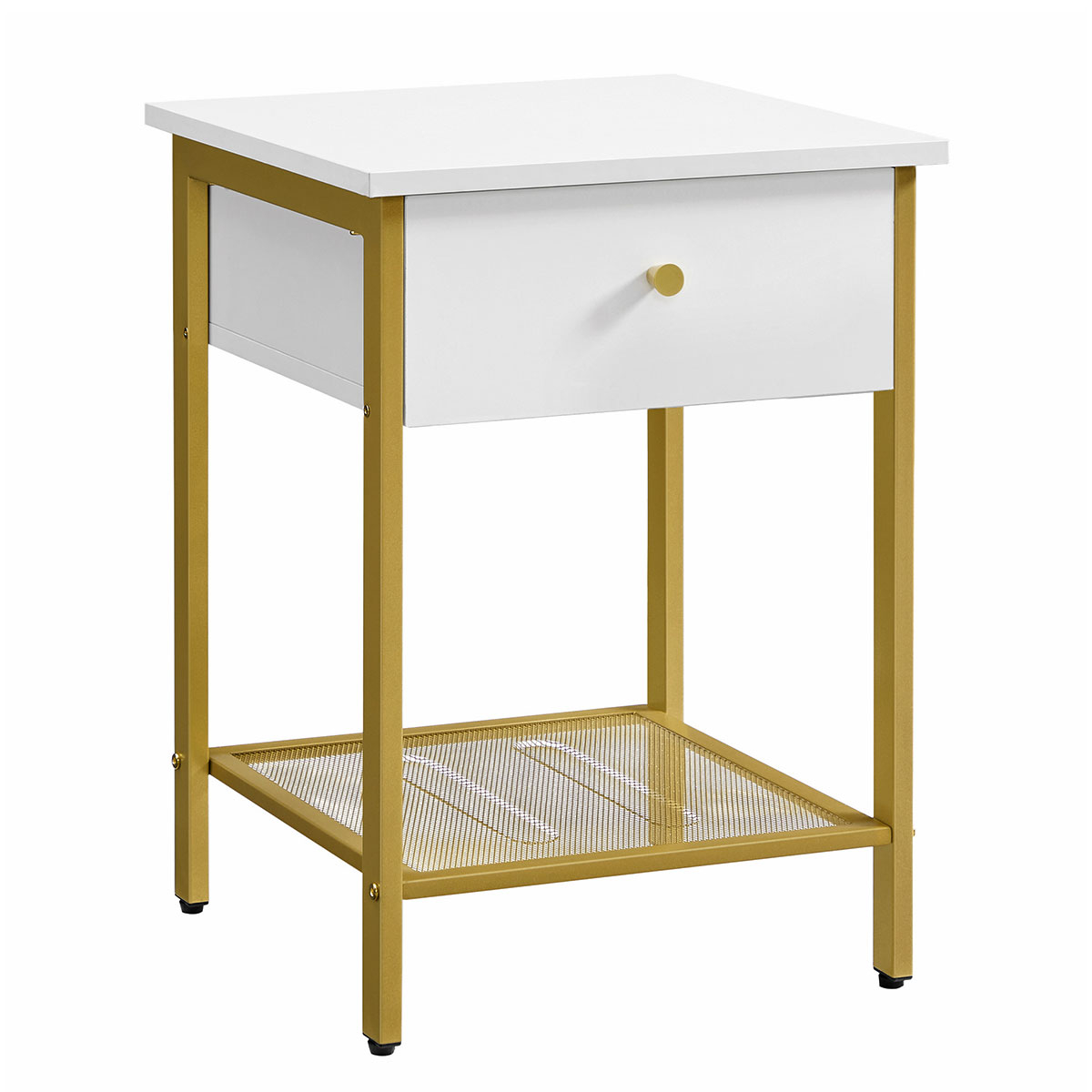 Κομοδίνο από την εταιρεία Vasagle σε λευκό χρώμα με χρυσό σκελετό. Διαθέτει χώρους για να αποθηκεύετε τα μικροπράγματα σας. Ιδανικό για να το τοποθετήσετε δίπλα από το κρεβάτι σας ή στο καθιστικό σαν βοηθητικό τραπεζάκι. Το προϊόν έρχεται αμοντάριστο και συναρμολογείται βάσει οδηγιών.