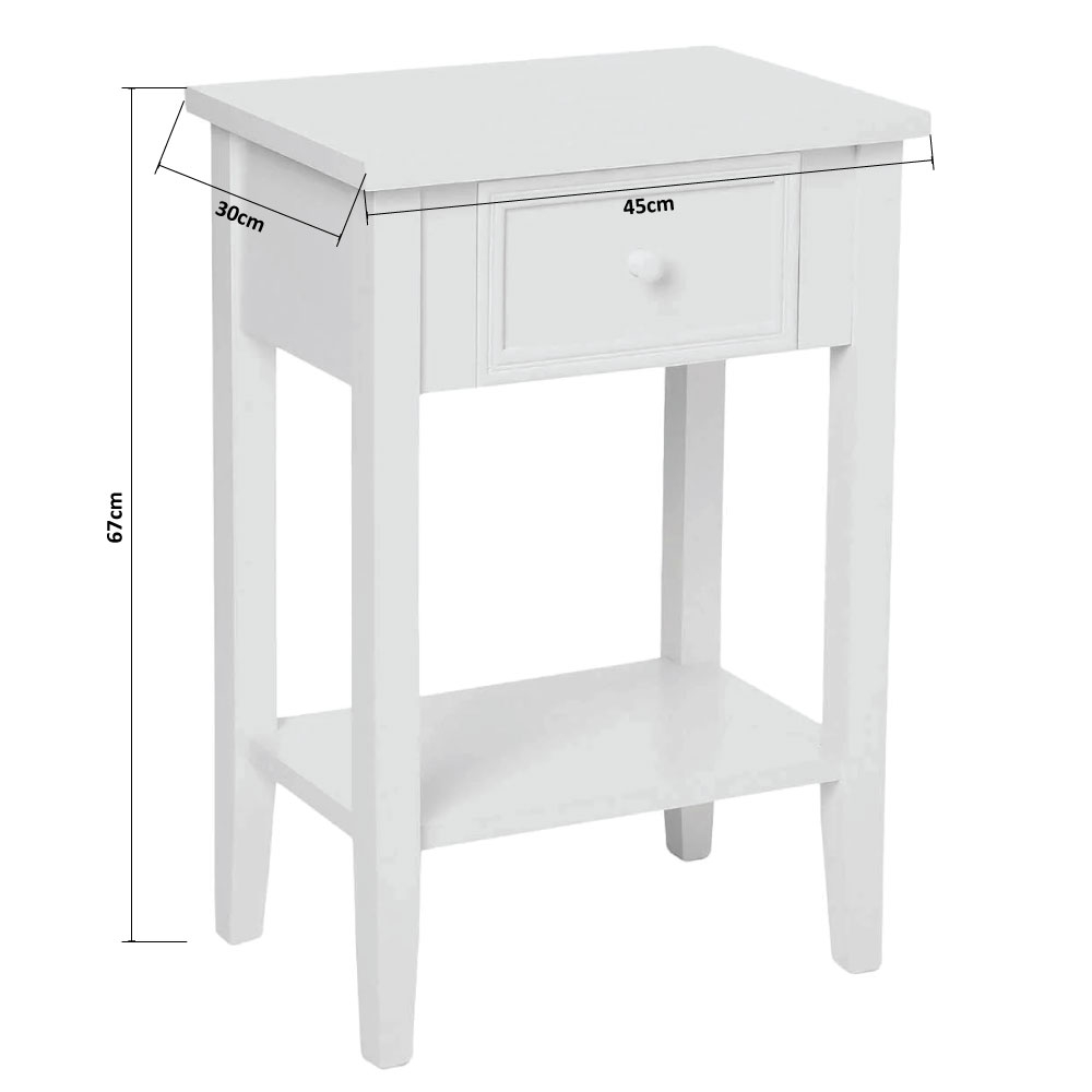 Κομοδίνο με συρτάρι και ραφάκι ιδανικό για τοποθέτηση δίπλα στο κρεβάτι, σε λευκό χρώμα. Εκτός από κομοδίνο, μπορεί να χρησιμοποιηθεί ως βοηθητικό τραπέζι στο σαλόνι, το χολ, το γραφείο, κλπ. Το προϊόν έρχεται αμοντάριστο και συναρμολογείται βάσει οδηγιών.