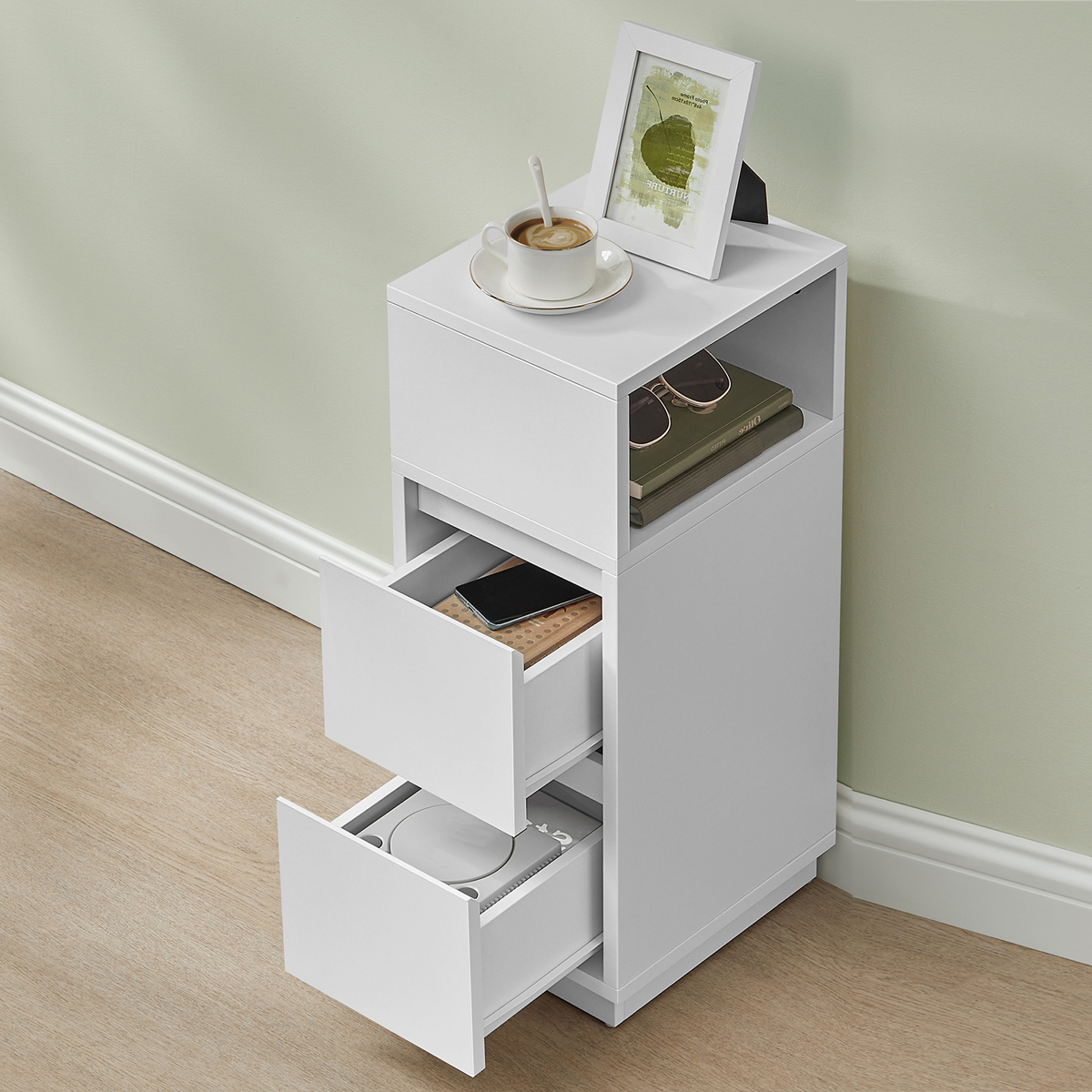 Κομοδίνο με συρτάρια και ράφι σε λευκό χρώμα από την εταιρεία Vasagle. Ιδανικό για να το τοποθετήσετε δίπλα από το κρεβάτι σας ή σαν βοηθητικό τραπεζάκι στο σαλόνι. Το προϊόν έρχεται αμοντάριστο και συναρμολογείται βάσει οδηγιών.