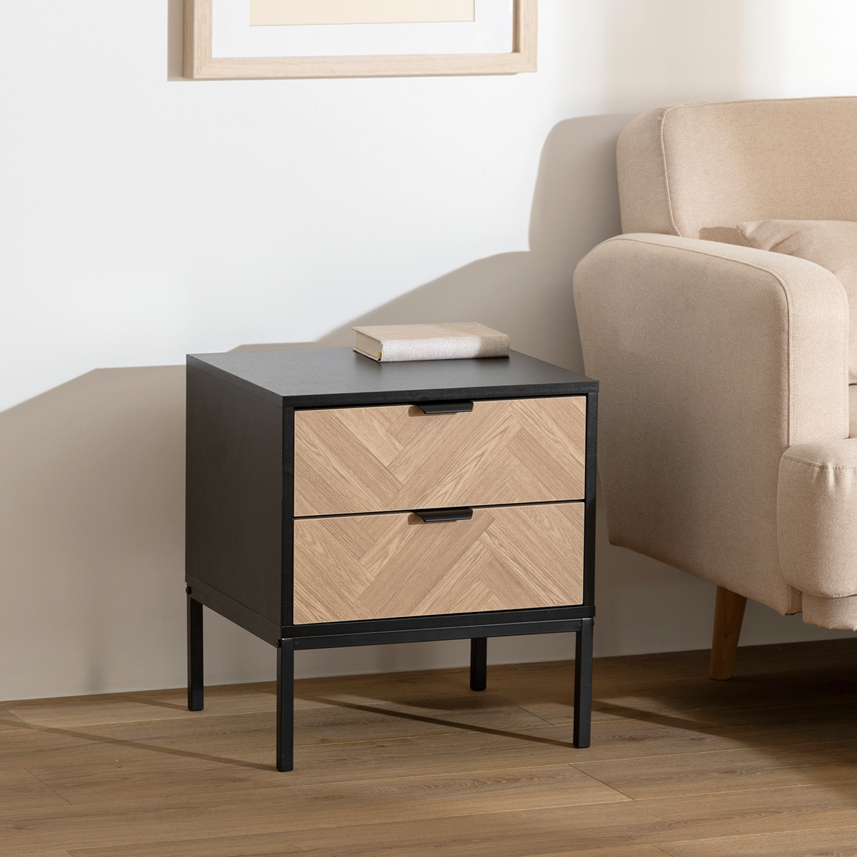 Κομοδίνο σε μαύρο χρώμα με 2 καφέ συρτάρια. Είναι κατασκευασμένο από μοριοσανίδα με μεταλλικές λεπτομέρειες. Συνδυάστε το με τα υπόλοιπα προϊόντα στο ίδιο σετ για μία αρμονική διακόσμηση στο χώρο σας. *Το προϊόν έρχεται αμοντάριστο και συναρμολογείται βάσει οδηγιών.*