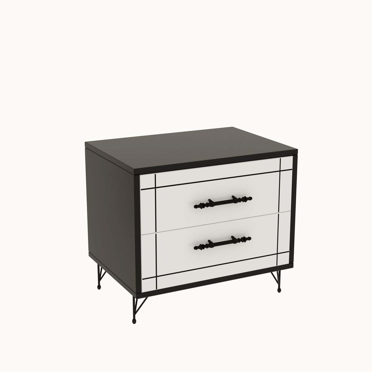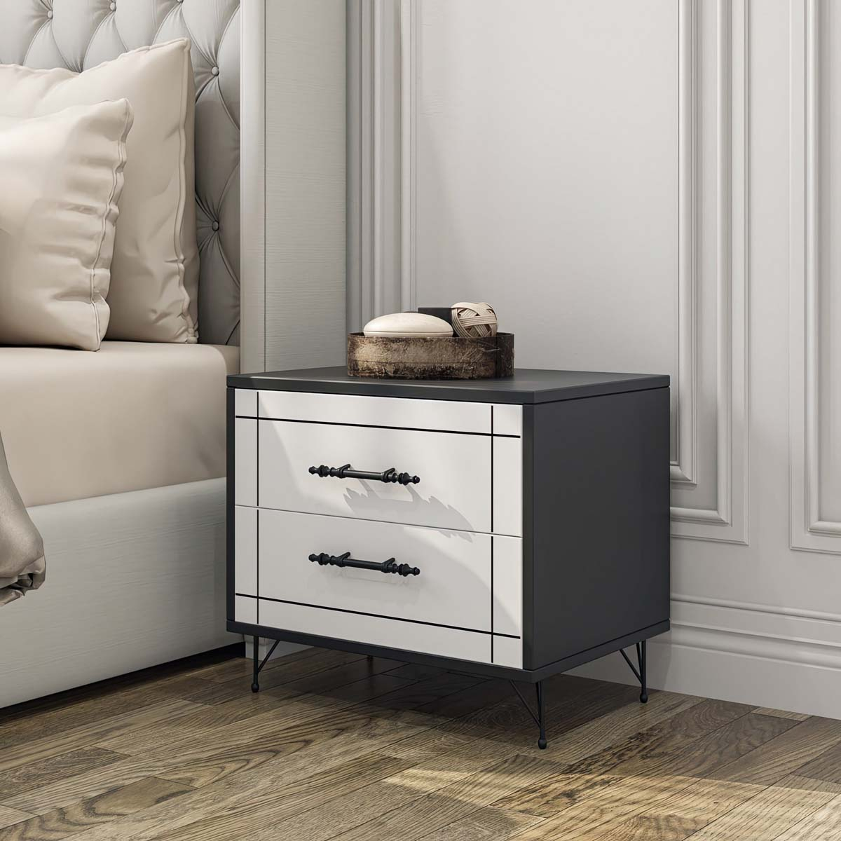 Κομοδίνο με μοντέρνο σχεδιασμό σε μαύρο-λευκό χρώμα. Διαθέτει συρτάρια που σας προσφέρουν αποθηκευτικό χώρο για να οργανώσετε και να τακτοποιήσετε τα πράγματά σας. Ιδανικό για να το τοποθετήσετε δίπλα από το κρεβάτι σας και να ολοκληρώσετε την διακόσμηση της κρεβατοκάμαράς σας με ένα καλαίσθητο και ταυτόχρονα λειτουργικό έπιπλο. Το προϊόν έρχεται αμοντάριστο και συναρμολογείται βάσει οδηγιών.