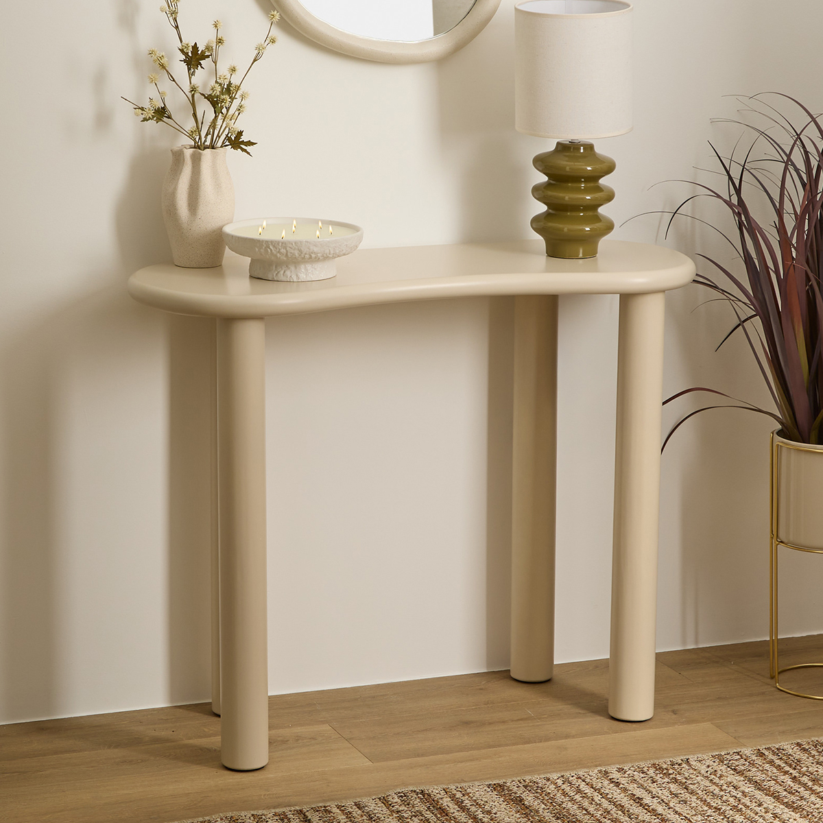 Κονσόλα με μοντέρνα αισθητική, κατάλληλη για να ακουμπάτε τα πράγματά σας. Είναι κατασκευασμένη από MDF_E1 με πόδια από ξύλο πεύκου και ακανόνιστο σχήμα. Το MDF είναι ένα συνθετικό υλικό που φτιάχνεται από λεπτές ίνες ξύλου και ρητίνες, το οποίο είναι αρκετά ανθεκτικό. Είναι βαμμένη με ακρυλικό χρώμα σε εκρού απόχρωση και ματ φινίρισμα. Ένα απαραίτητο έπιπλο για τον χώρο σας που μπορεί να τοποθετηθεί στο σαλόνι, στο χολ ή σε όποιον άλλο χώρο επιθυμείτε. Συνδυάστε τη με τα υπόλοιπα είδη της ίδιας σειράς για ένα ολοκληρωμένο αποτέλεσμα στο χώρο σας. *Το προϊόν έρχεται αμοντάριστο και συναρμολογείται βάσει οδηγιών.*