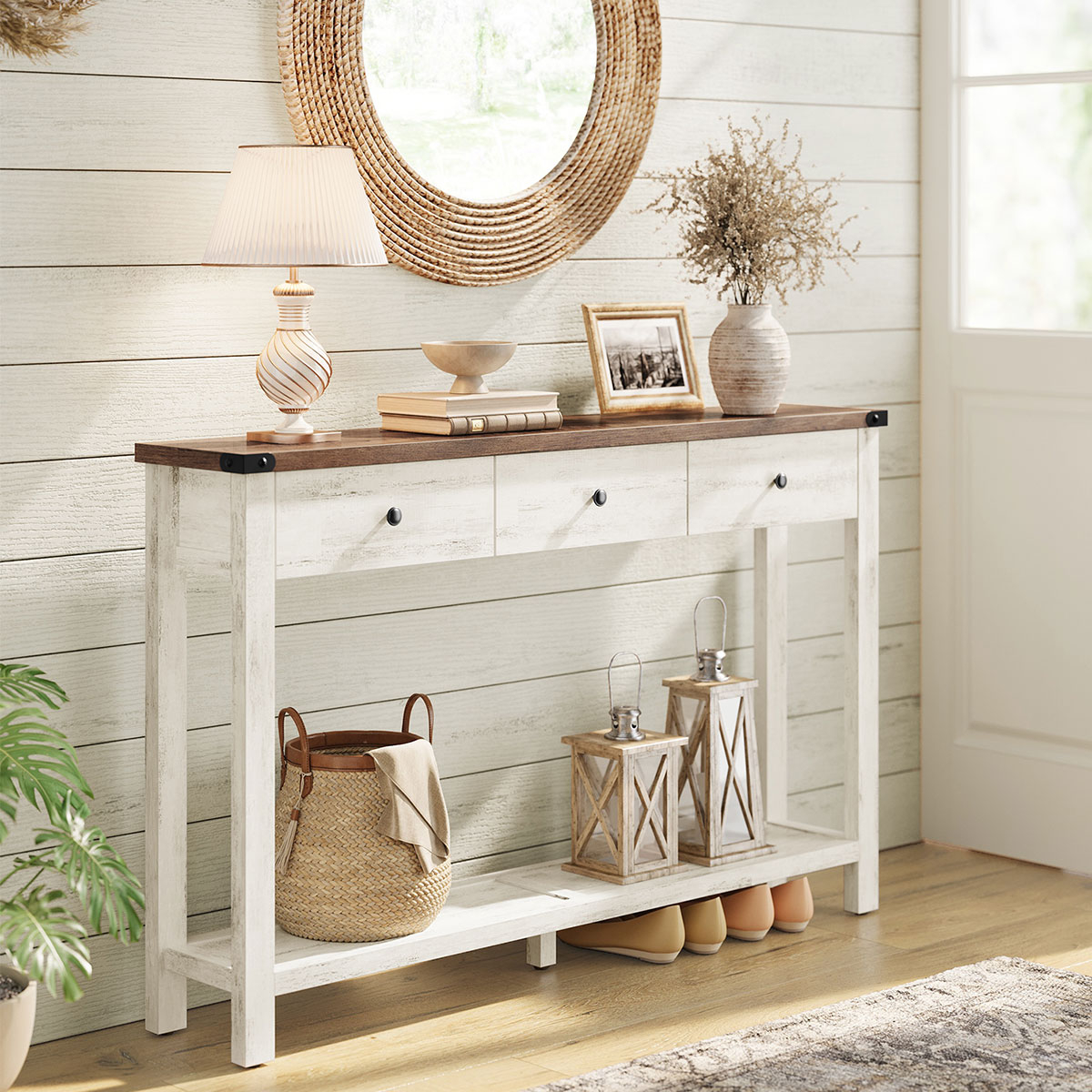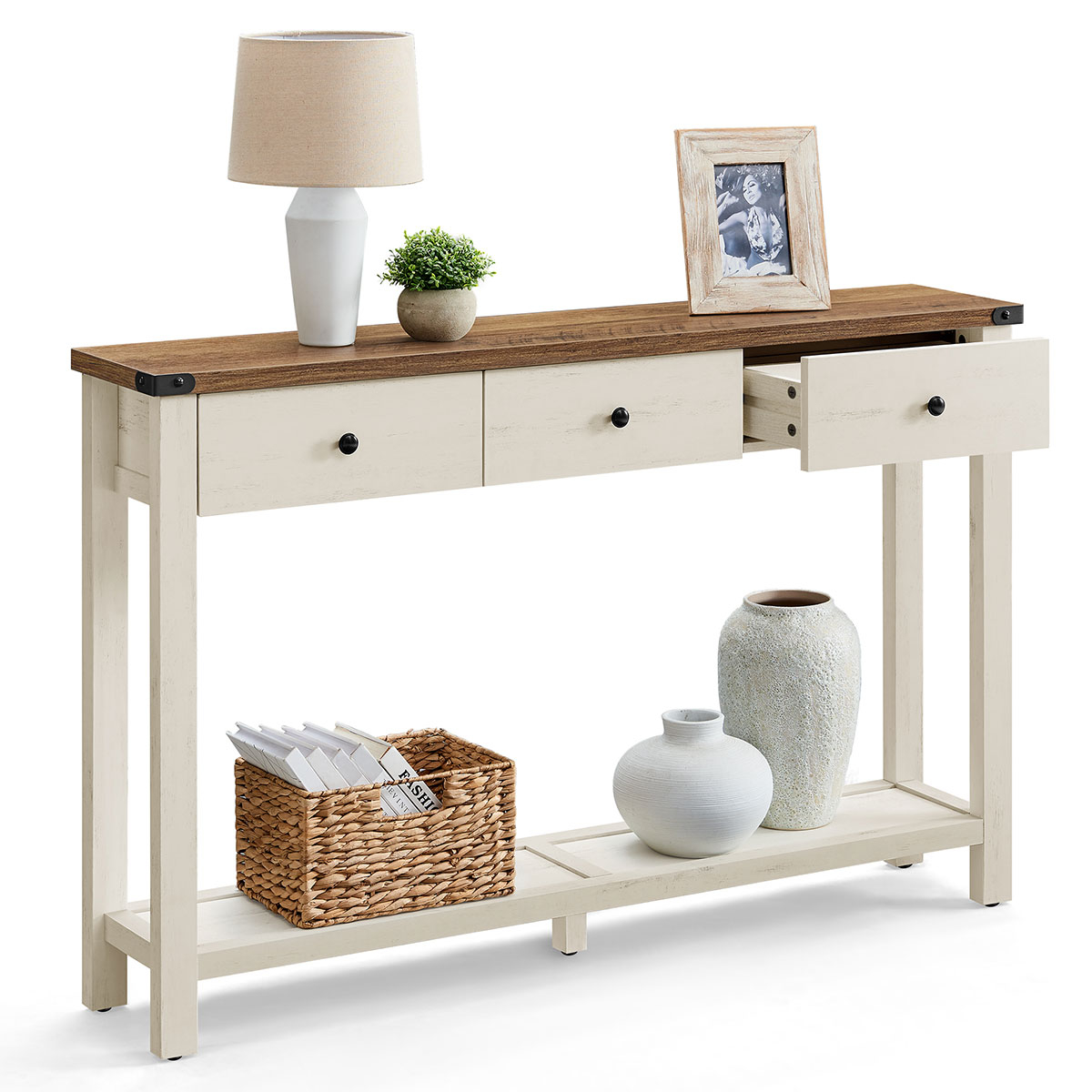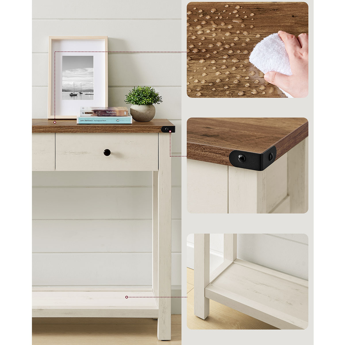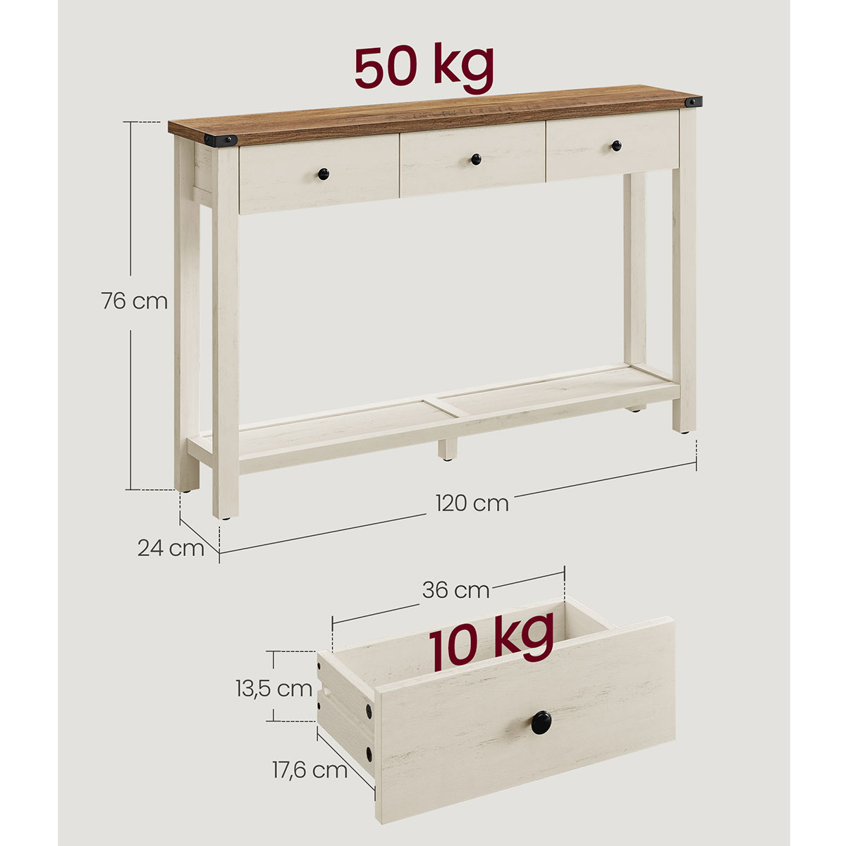 Κονσόλα με ράφι και συρτάρια από την εταιρεία Vasagle, με μοντέρνο σχεδιασμό. Είναι κατασκευασμένη από ξύλο MDF και μοριοσανίδα σε ανοιχτό καφέ και εκρού χρώμα (Vintage White). Διαθέτει 1 μεγάλο ράφι στο κάτω μέρος και 3 συρτάρια για να τακτοποιήσετε τα πράγματα σας. Ιδανικό έπιπλο για την κρεβατοκάμαρα, το σαλόνι ή την είσοδο του σπιτιού. Συνολικό μέγιστο βάρος αντοχής: 80kg. *Το προϊόν έρχεται αμοντάριστο και συναρμολογείται βάσει οδηγιών.*
