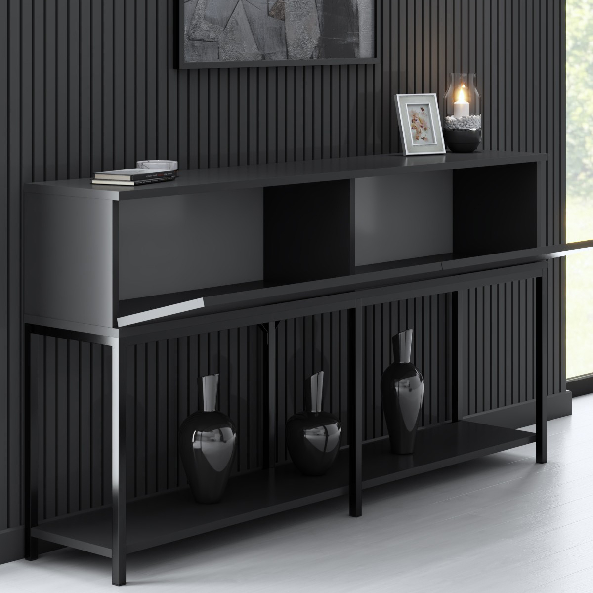 Κονσόλα εισόδου με μοντέρνο σχεδιασμό σε ανθρακί απόχρωση. Είναι κατασκευασμένη από μοριοσανίδα, με επένδυση μελαμίνης και έχει μεταλλικά μαύρα πόδια. Διαθέτει μεγάλο αποθηκευτικό χώρο, με 1 ράφι και 2 ντουλάπια. Είναι ιδανική για το σαλόνι, την τραπεζαρία και την είσοδο του σπιτιού, συμπληρώνοντας μία μοντέρνα διακόσμηση. Μέγιστο βάρος αντοχής: 25 kg *Το προϊόν έρχεται αμοντάριστο και συναρμολογείται βάσει οδηγιών.*
