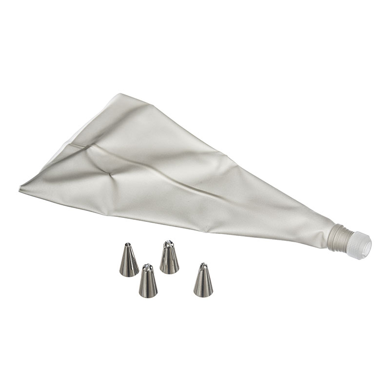 Σετ κορνέ ζαχαροπλαστικής για σαντιγί. Είναι κατασκευασμένο από εύκαμπτο πλαστικό υλικό, κατάλληλο για επαφή με τρόφιμα. Διαθέτει 4 ανοξείδωτες μύτες με διαφορετικό άνοιγμα, για να επιλέξετε την ποσότητα που θέλετε να βγάζει και να φτιάξετε υπέροχα σχέδια.