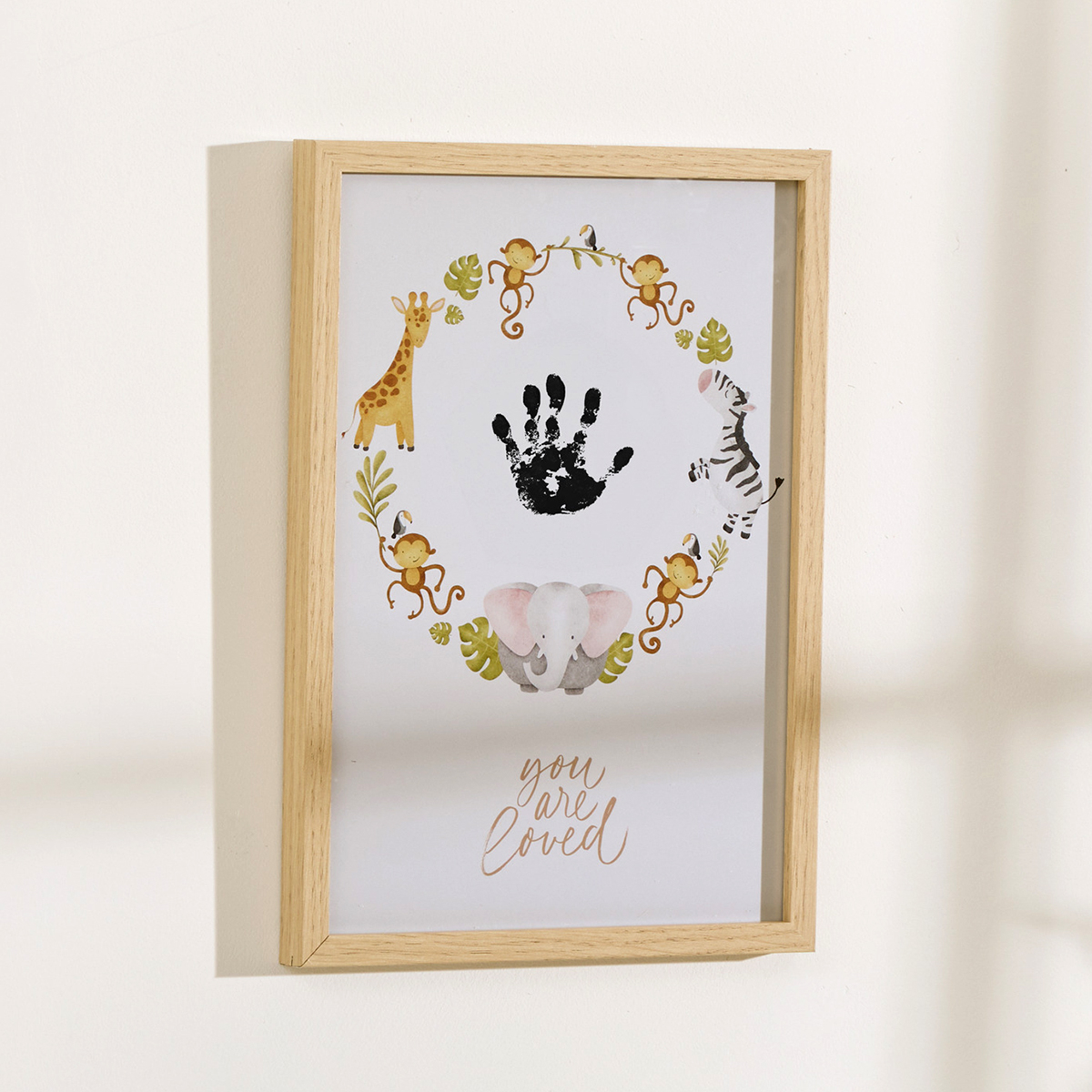 Αποτύπωμα μελανιού και κορνίζα που θα σας επιτρέψει να κρατήσετε το πατουσάκι ή το χεράκι του μωρού σας ως ενθύμιο. Ολοκληρωμένο κιτ που περιλαμβάνει κορνίζα κατασκευασμένη από ξύλο MDF_E1 σε μπεζ απόχρωση με τζάμι μπροστά και αποτύπωμα μελανιού με ταμπόν για να εμποδίσει το παιδί να έρθει σε άμεση επαφή με το μελάνι. Περιλαμβάνονται οδηγίες για εύκολη δημιουργία του αποτυπώματος πάνω στη συσκευασία. Δημιουργήστε μια γλυκιά ανάμνηση που θα την έχετε για πάντα. Κατάλληλο διακοσμητικό για κάθε βρεφικό δωμάτιο. Ιδανικό δώρο γέννησης, baby shower ή μαιευτηρίου.