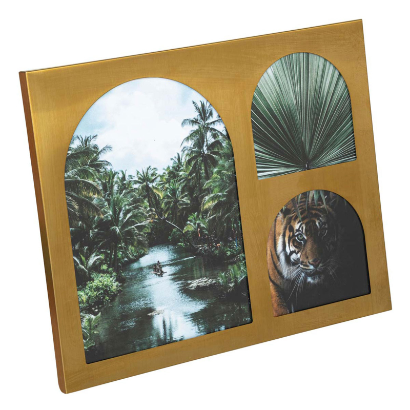 Επιτοίχια πολυκορνίζα με θέσεις για 3 φωτογραφίες. Είναι κατασκευασμένη από μεταλλικό υλικό σε χρυσό χρώμα, με MDF_E1 πλάτη και γυαλί στο μπροστά μέρος. Μπορεί να τοποθετηθεί σε κάποιο έπιπλο ή να κρεμαστεί στον τοίχο. Τοποθετήστε την στον χώρο σας και διακοσμήστε τον με τις πιο όμορφες αναμνήσεις σας. Έχει χώρο για 1 φωτογραφία 13x18 και για 2 φωτογραφίες 8x8.