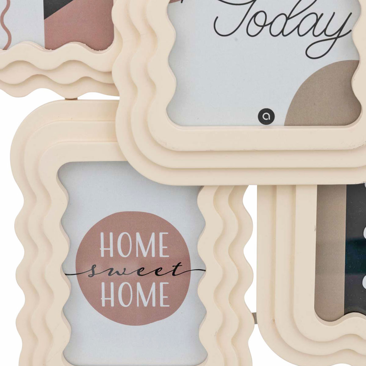 Επιτοίχια πολυκορνίζα με θέσεις για 5 φωτογραφίες. Είναι κατασκευασμένη από ξύλο MDF_E1 σε εκρού χρώμα με ανάγλυφο μοντέρνο σχέδιο. Η κορνίζα μπορεί να τοποθετηθεί σε κάθετη ή οριζόντια θέση. Φυλάξτε τις πιο ξεχωριστές στιγμές της ζωής σας σε μια μοναδική κορνίζα. Συνδυάστε τη με τα υπόλοιπα είδη της ίδιας συλλογής για ένα ολοκληρωμένο αποτέλεσμα στο χώρο σας.