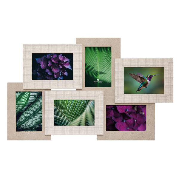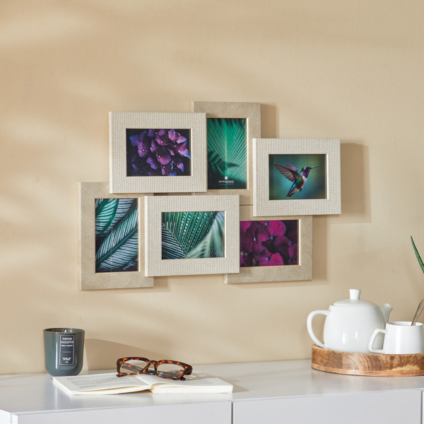 Επιτοίχια πολυκορνίζα με θέσεις για 6 φωτογραφίες. Είναι κατασκευασμένη από πλαστικό υλικό σε γκρι-μπεζ χρώμα με γυαλί στο μπροστινό μέρος. Η κορνίζα μπορεί να τοποθετηθεί σε κάθετη ή οριζόντια θέση. Φυλάξτε τις πιο ξεχωριστές στιγμές της ζωής σας σε μια μοναδική κορνίζα. Συνδυάστε τη με τα υπόλοιπα είδη της ίδιας συλλογής για ένα ολοκληρωμένο αποτέλεσμα στο χώρο σας.