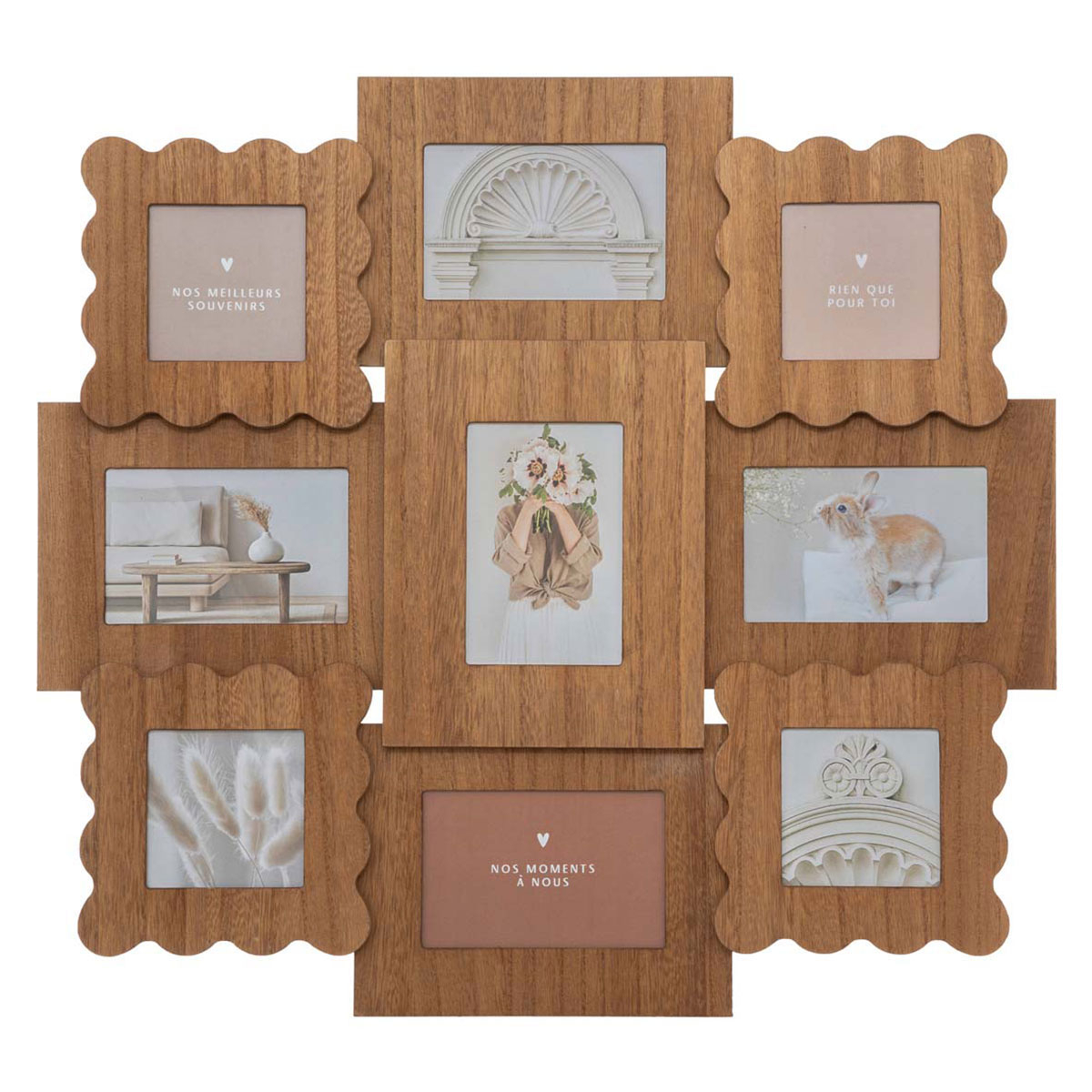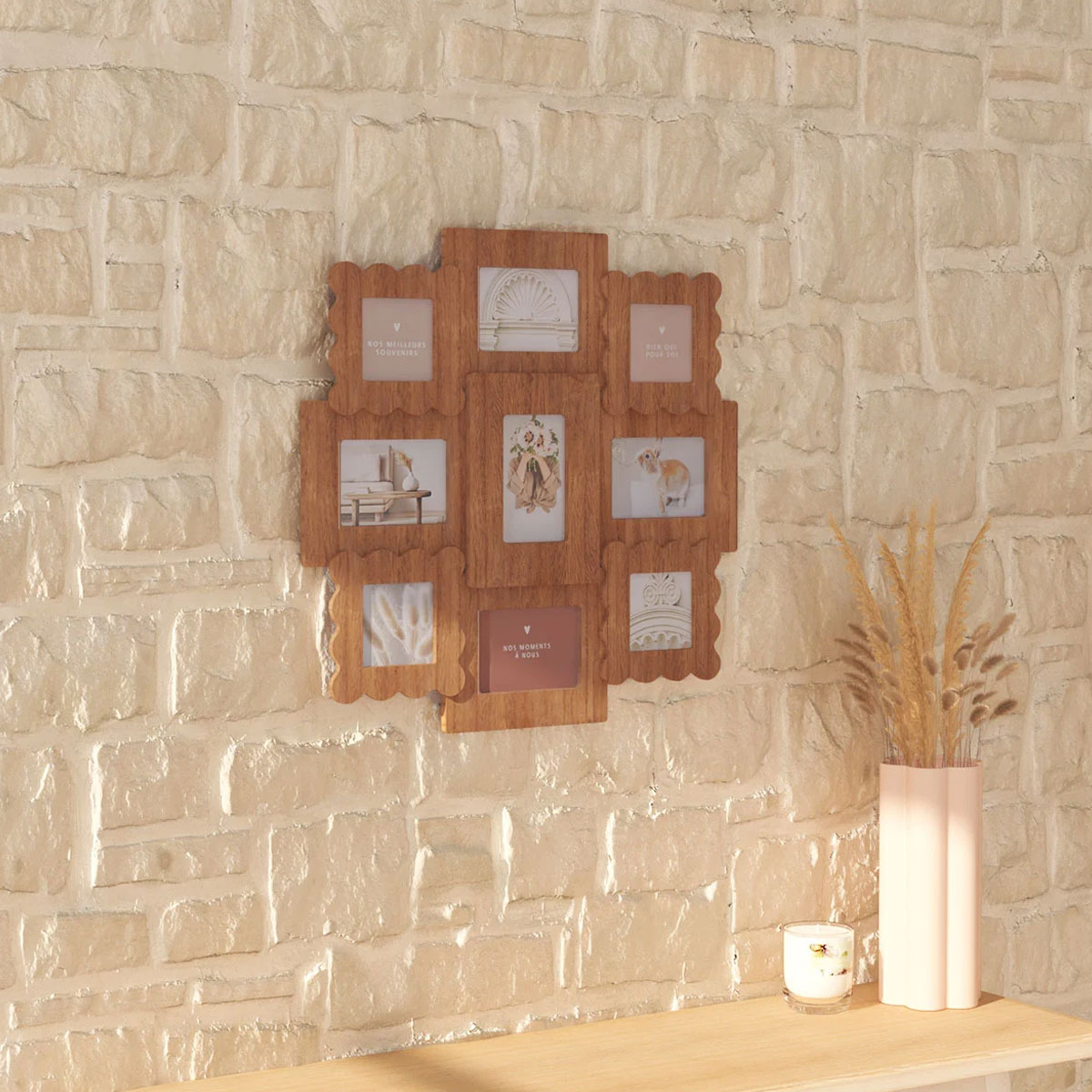 Επιτοίχια πολυκορνίζα με θέσεις για 9 φωτογραφίες. Είναι κατασκευασμένη από ξύλο MDF_E1 σε καφέ χρώμα και έχει γυαλί στο μπροστά μέρος. Μπορεί να τοποθετηθεί κάθετα ή οριζόντια. Τοποθετήστε την στον χώρο σας και διακοσμήστε τον με τις πιο όμορφες αναμνήσεις σας.