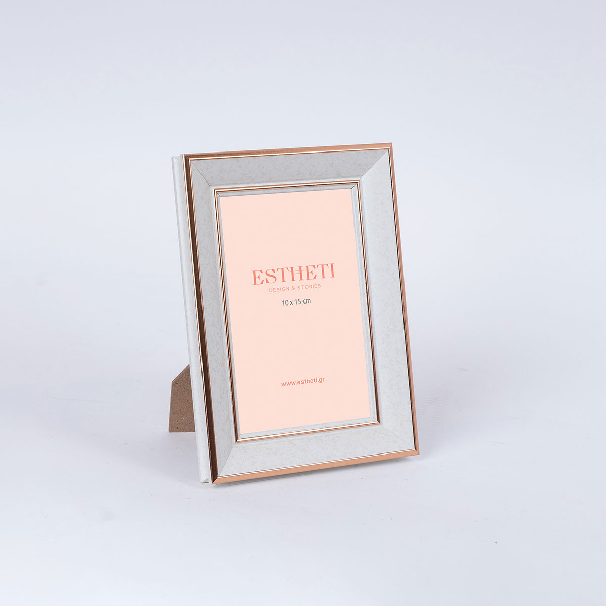 Κορνίζα από την εταιρεία Estheti σε λευκό χρώμα με χρυσές λεπτομέρειες και μοντέρνο σχέδιο. Είναι κατασκευασμένη από πλαστικό υλικό. Η κορνίζα είναι επικαθήμενη. Η επικαθήμενη σχεδίαση της δίνει την δυνατότητα να τοποθετηθεί εύκολα σε οποιοδήποτε τραπέζι ή επιφάνεια. Φυλάξτε τις πιο ξεχωριστές στιγμές της ζωής σας σε μια μοναδική κορνίζα.