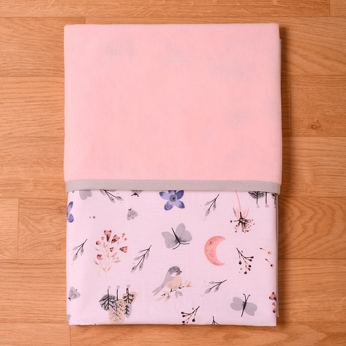Κουβέρτα φλις από την εταιρεία Abo για την αγκαλιά ή το λίκνο του μωρού διπλής όψης. Η μία πλευρά της είναι σε ροζ φόντο με γκρι-μπλε λεπτομέρειες και φλοράλ σχέδιο κατασκευασμένη από 100% βαμβάκι. Η άλλη πλευρά είναι πολυεστερική σε ροζ χρώμα. Είναι ιδανική για νεογέννητα μωρά. Συνδυάστε την με τα υπόλοιπα είδη του ίδιου σχεδίου για ένα ολοκληρωμένο αποτέλεσμα.