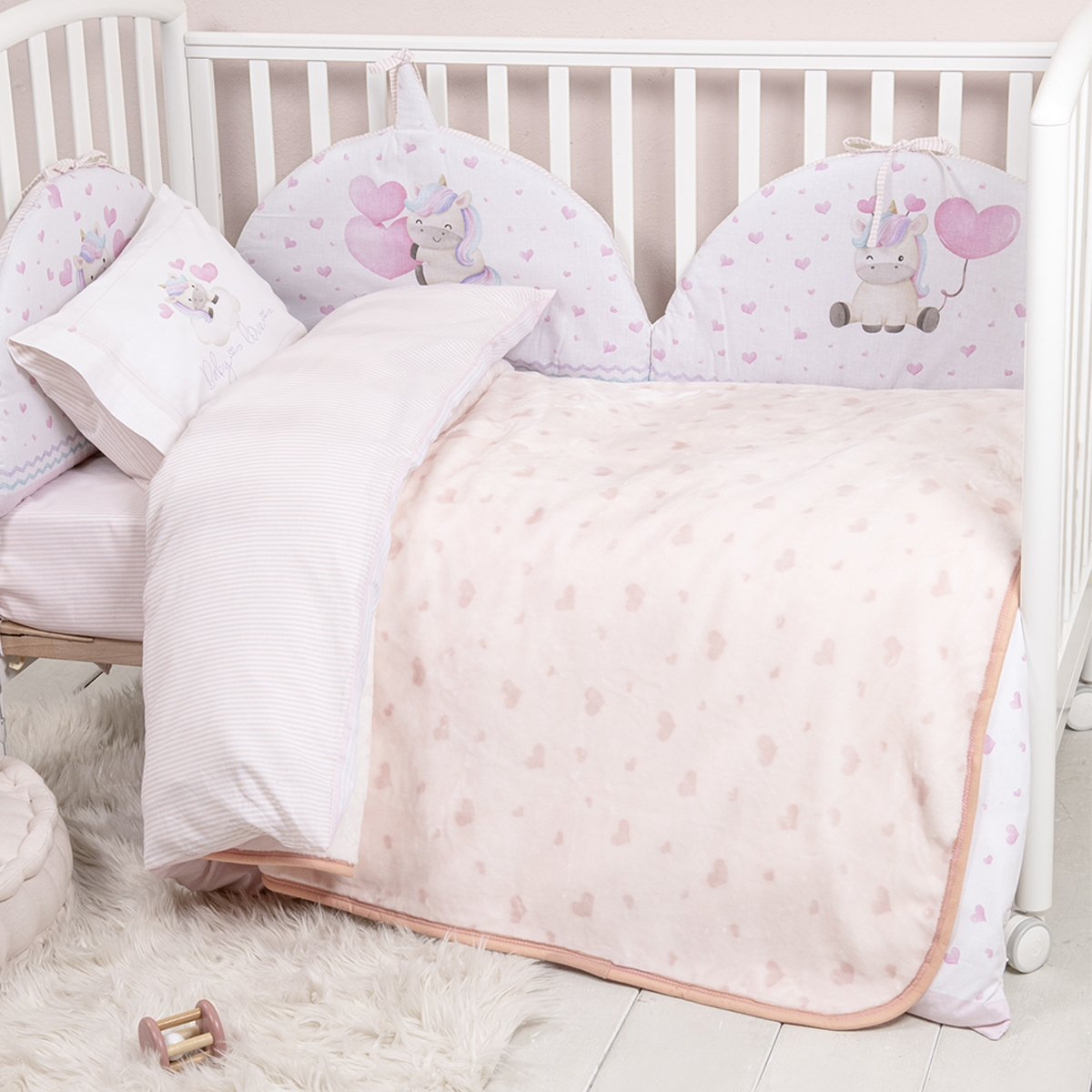 Βρεφική βελουτέ κουβέρτα για την κούνια σε σομόν χρώμα και σχέδιο καρδιές από την εταιρεία Nima. Είναι κατασκευασμένη από 100% polyester με περιμετρικό ρέλι, ιδανική για το χειμώνα. Συνδυάστε την, με τα υπόλοιπα είδη της ίδιας σειράς για ένα ολοκληρωμένο αποτέλεσμα.