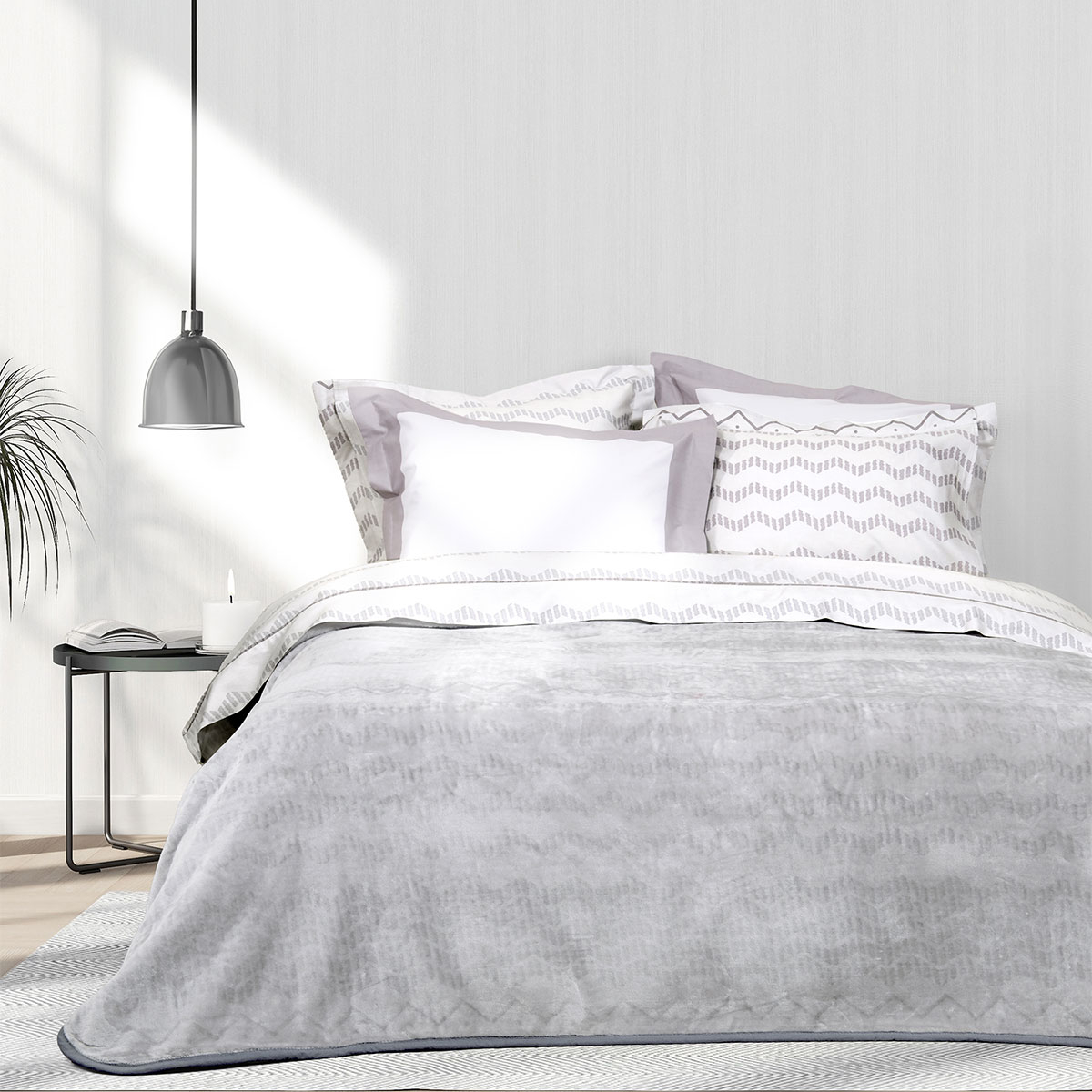 Μονή βελουτέ κουβέρτα σε γκρι χρώμα με μοντέρνο σχέδιο από την εταιρεία Nima. Είναι κατασκευασμένη από 100% polyester βάρους 550gsm με περιμετρικό ρέλι, που την καθιστά ιδανική για το χειμώνα. Συνδυάστε την με τα υπόλοιπα είδη της ίδια σειράς για ένα ολοκληρωμένο αποτέλεσμα.