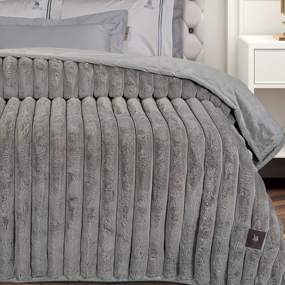 Κουβέρτα γούνινη υπέρδιπλη σε γκρι χρώμα με ανάγλυφο σχέδιο από τον οίκο Greenwich Polo. Η πάνω πλευρά είναι faux fur από 100% polyester, ενώ η πίσω πλευρά είναι από βελουτέ ύφασμα σύνθεσης 100% polyester και βάρους 680gsm. Ιδανικό για τους χειμερινούς μήνες.