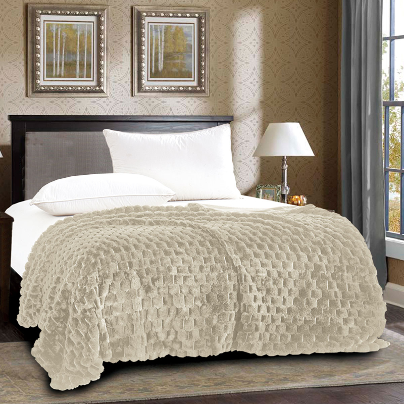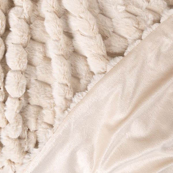 Υπέρδιπλη γούνινη κουβέρτα της εταιρείας Silk Fashion σε εκρού απόχρωση με ανάγλυφη επιφάνεια. Είναι κατασκευασμένη από 100% polyester με βελούδινη επένδυση που προσομοιάζει την αίσθηση γούνας ζώου. H ποιότητάς της την καθιστά ανθεκτική και εύκολη στο πλύσιμο ακόμα και στο πλυντήριο χωρίς να χάνει την απαλή υφή της. Ιδανική κουβέρτα που θα σας συντροφεύσει τους χειμερινούς και φθινοπωρινούς μήνες.