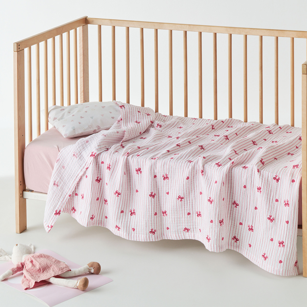 Βρεφική κουβέρτα για την αγκαλιά από την εταιρεία Kentia, σε ροζ χρώμα με μοντέρνο σχέδιο. Είναι κατασκευασμένη από 100% υψηλής ποιότητας βαμβακερή μουσελίνα 160gsm, ιδανική για τους ανοιξιάτικους και καλοκαιρινούς μήνες. Το βαμβακερό ύφασμα μουσελίνας ξεχωρίζει για την εξαιρετική απαλότητα, τη δροσερή αίσθηση και την υψηλή διαπνοή του, προσφέροντας άνετο και ευχάριστο ύπνο. Είναι ελαφριά, φιλική προς το δέρμα, κατάλληλη και για ευαίσθητες επιδερμίδες.