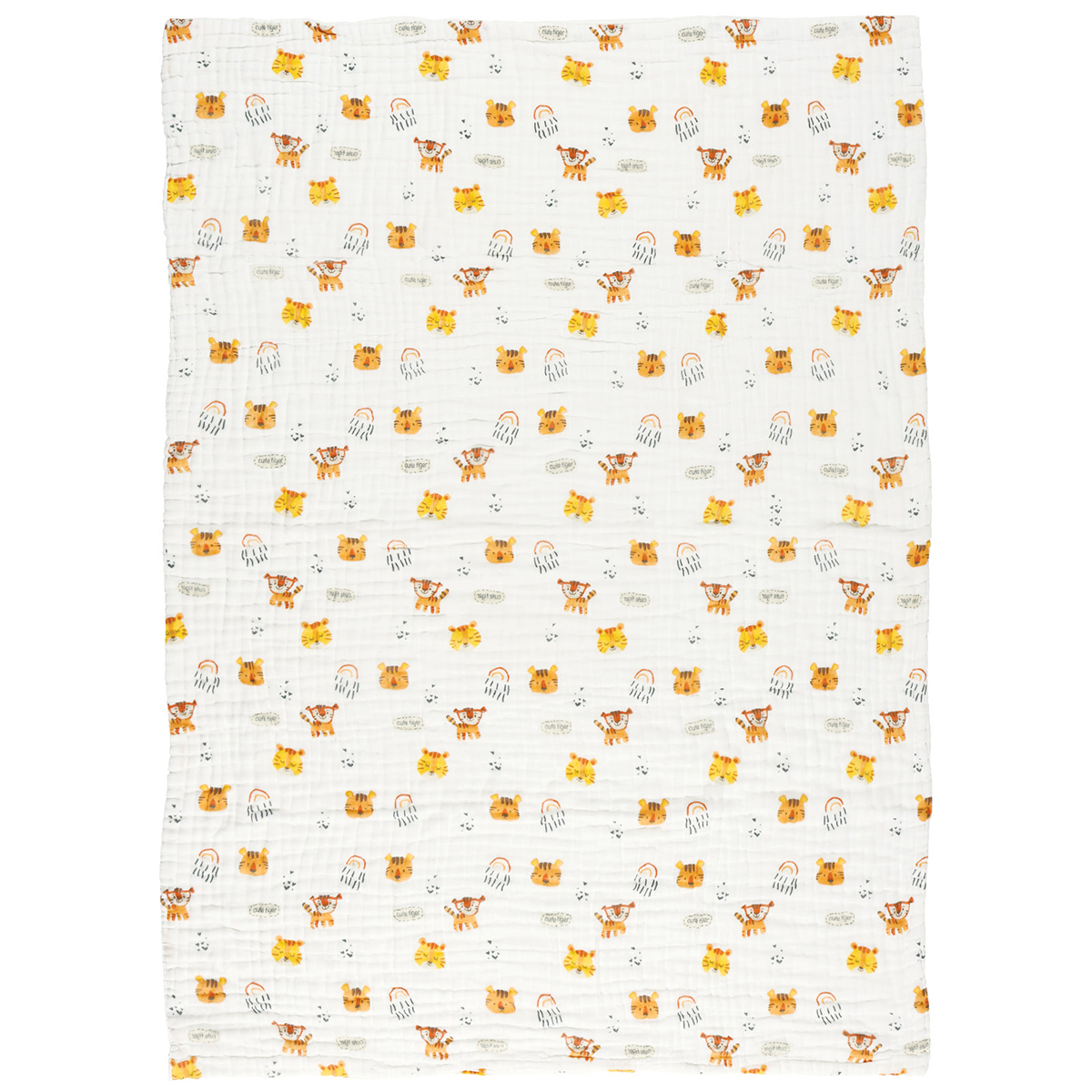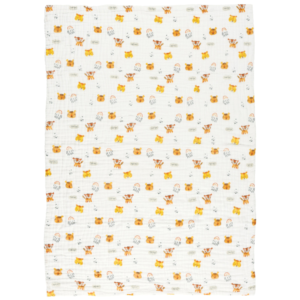 Κουβέρτα μουσελίνα κούνιας σε λευκό χρώμα, με πορτοκαλί λεπτομέρειες και σχέδιο λιονταράκια από την εταιρία Das Home. Είναι κατασκευασμένη από 100% βαμβάκι και είναι απαλή και λεπτή. Ιδανική για τους καλοκαιρινούς μήνες.