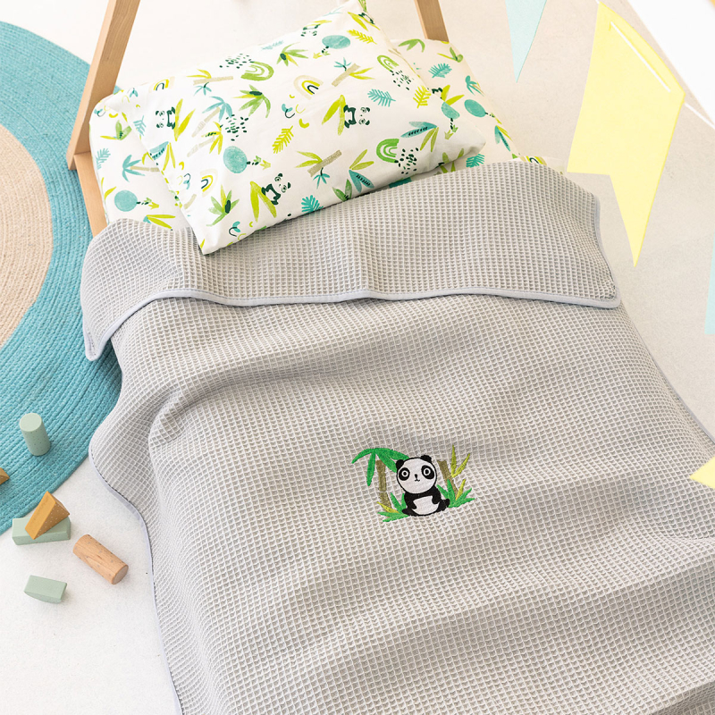Βρεφική πικέ κουβέρτα από την εταιρεία Palamaiki για την κούνια του μωρού. Σε γκρι χρώμα και κέντημα με χαριτωμένο πάντα. Η σύνθεσή της είναι 100% βαμβάκι βάρους 260gsm. Ιδανική για τους καλοκαιρινούς μήνες.