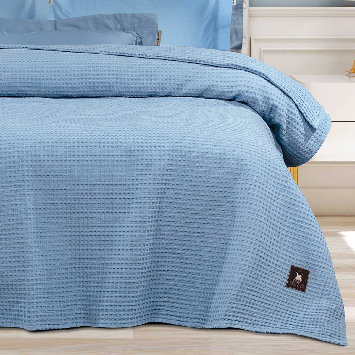 Μονή κουβέρτα πικέ σε μπλε χρώμα από τον οίκο Greenwich Polo Club. Η σύνθεση του είναι 100% βαμβάκι, με υποαλλεργικά, ανεξίτηλα χρώματα. Ο τύπος ύφανσης της την καθιστά ιδιαίτερα απαλή και ανθεκτική. Ιδανικό σκέπασμα για τους καλοκαιρινούς μήνες.