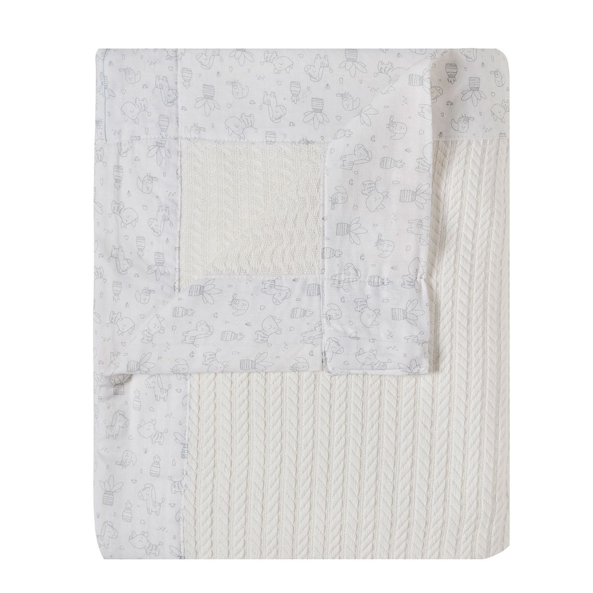 Βρεφική πλεκτή κουβέρτα για την αγκαλιά ή το λίκνο του μωρού από την εταιρεία Kentia. Έχει εκρού χρώμα και υφασμάτινη μπορντούρα με σχέδιο ζωάκια. Η σύνθεσή της είναι 100% βαμβάκι ζακάρ βάρους 300gr/m2. Ιδανική κουβέρτα για τους καλοκαιρινούς μήνες. Συνδυάστε την με τα υπόλοιπα προϊόντα του ίδιου σχεδίου για ένα ολοκληρωμένο αποτέλεσμα.