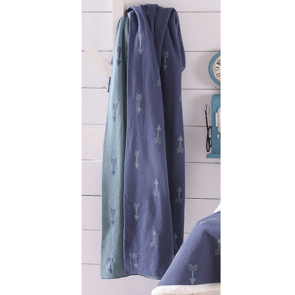 Βρεφική πλεκτή κουβέρτα για τo λίκνο ή την αγκαλιά σε μπλε χρώμα από την μια πλευρά και γαλάζιο χρώμα από την άλλη πλευρά με μοντέρνο σχέδιο. Σύνθεση από 100% βαμβακερό ζακάρ ύφασμα. Ιδανική κουβέρτα για τους καλοκαιρινούς μήνες.