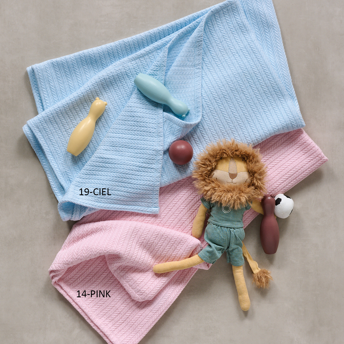 Μονή πλεκτή κουβέρτα από την εταιρεία Kentia σε ροζ ή γαλάζιο χρώμα. Η σύνθεσή της είναι 100% βαμβάκι ζακάρ 300gr/m2. Ιδανική για να στολίσει κάθε παιδικό δωμάτιο, κατά τους ανοιξιάτικους και καλοκαιρινούς μήνες.