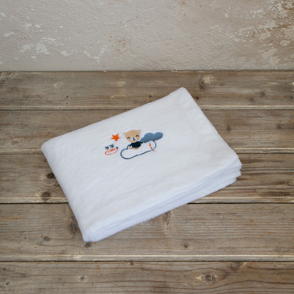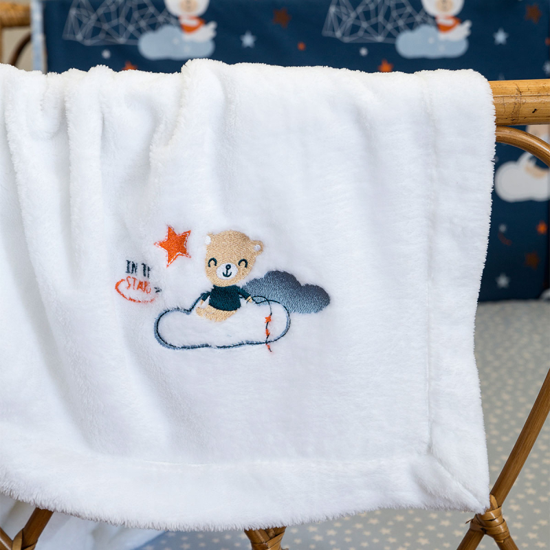 Κουβέρτα φλις για το λίκνο ή την αγκαλιά από την εταιρεία Nima με σχέδιο ζωάκια. Η σύνθεση της είναι 100% polyester σε λευκό χρώμα με κέντημα και πολύχρωμες λεπτομέρειες. Συσκευασία σε χάρτινο κουτί.