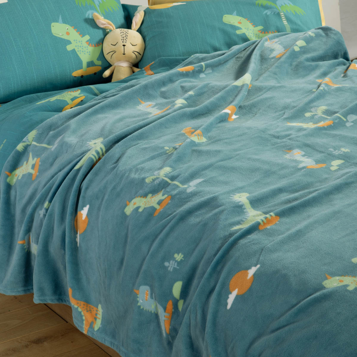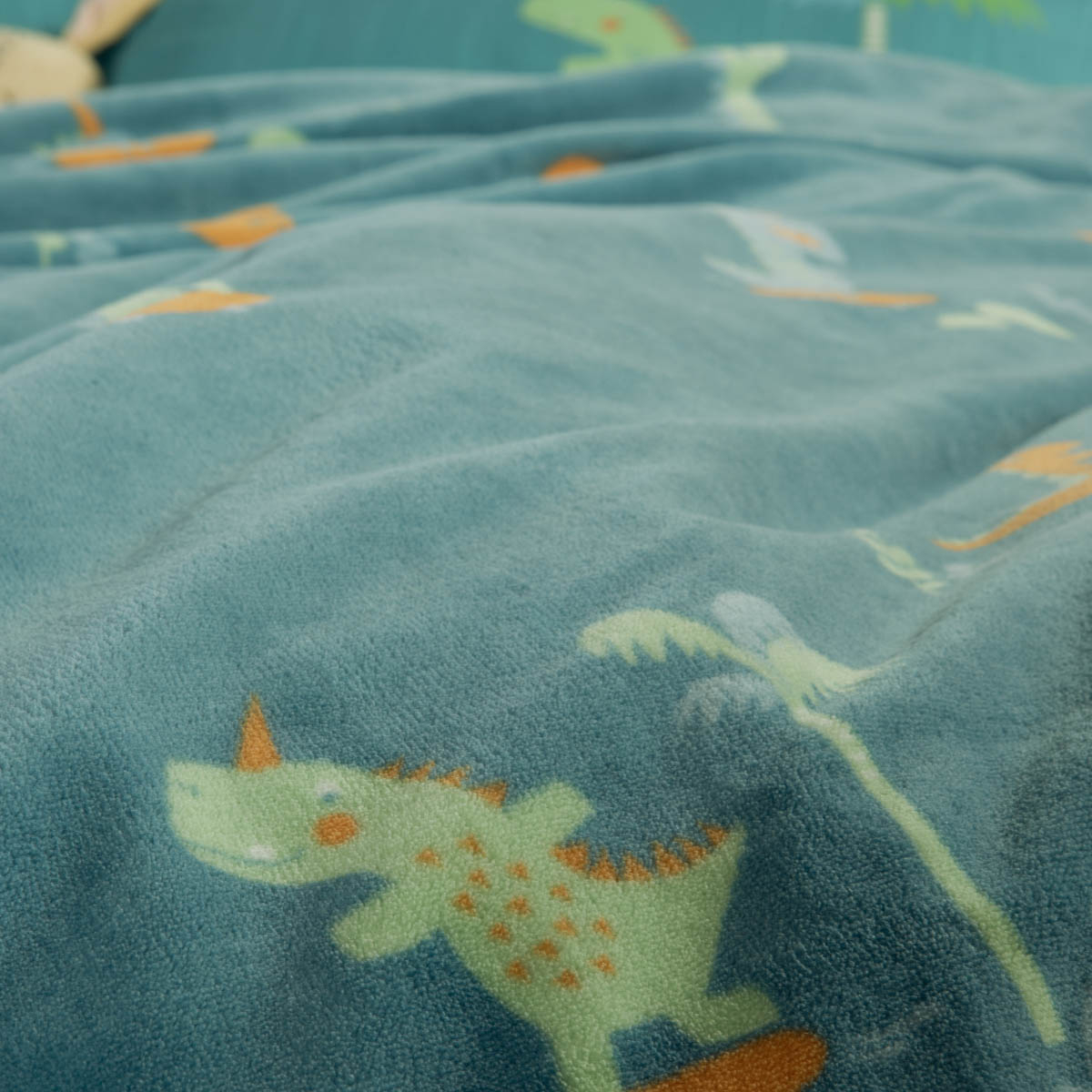 Κουβέρτα φλις μονή σε πετρόλ χρώμα με λαχανί-γαλάζιες-πορτοκαλί λεπτομέρειες και σχέδιο δεινοσαύρων από την εταιρεία Nef-Nef. Η ποιότητά της από coral fleece 100% polyester και το βάρος της 300gsm, προσφέρουν εξαιρετική απαλότητα και ζεστασιά. Ιδανικό σκέπασμα για τους φθινοπωρινούς και χειμερινούς μήνες. Συνδυάστε το με τα υπόλοιπα είδη της ίδιας σειράς για ένα ολοκληρωμένο σετ. Η εταιρεία Nef-Nef διαθέτει πιστοποίηση Oeko-Tex, που εγγυάται ότι τα προϊόντα της είναι απαλλαγμένα από επιβλαβείς χημικές ουσίες.