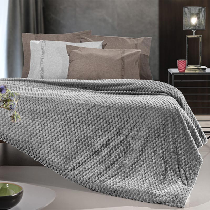 Κουβέρτα φλις υπέρδιπλη από την εταιρεία Guy Laroche σε σκούρο γκρι χρώμα και ανάγλυφο σχέδιο. Το ύφασμα της είναι από 100% velour microfiber που χαρίζει πολύ απαλή υφή και ζεστασιά. Ιδανική για τους φθινοπωρινούς μήνες. Περιλαμβάνεται διακοσμητική μαξιλαροθήκη. Ιδανικό σκέπασμα για τους φθινοπωρινούς και χειμερινούς μήνες.