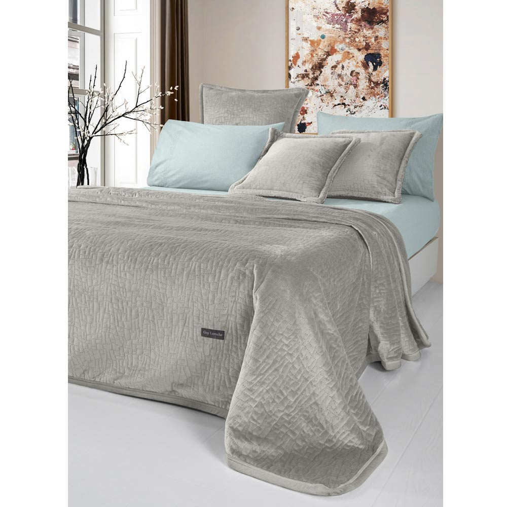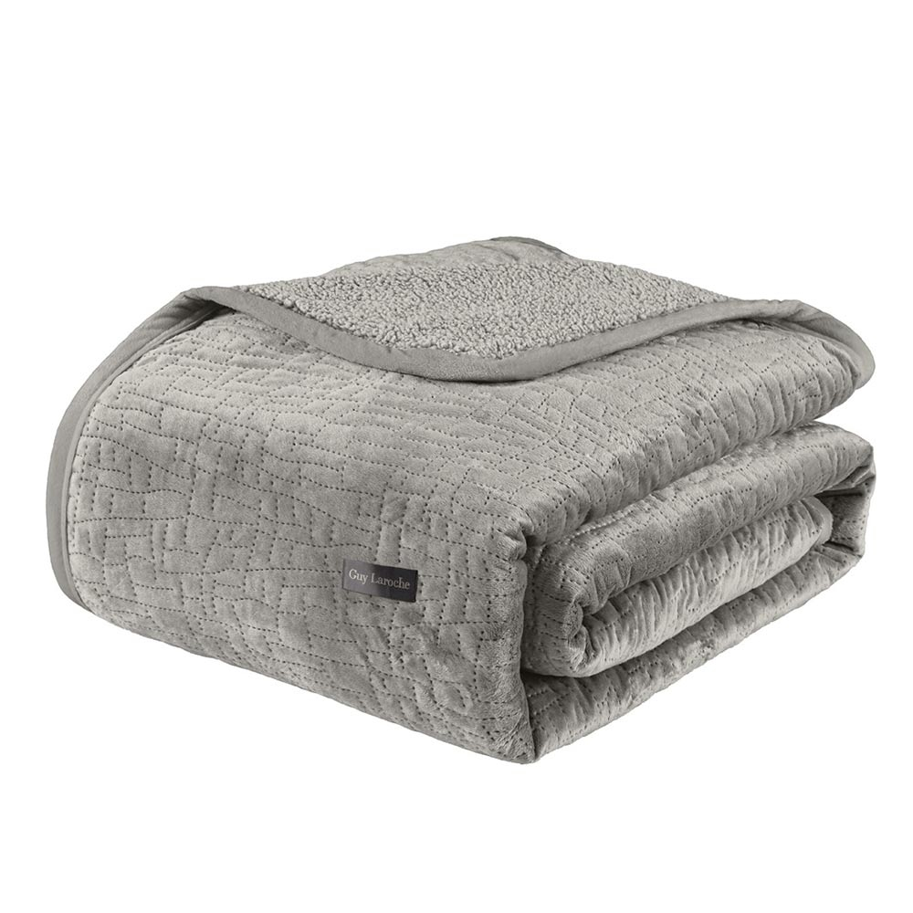 Ημίδιπλο κουβερλί με γουνάκι από την εταιρεία Guy Laroche σε γκρι-μπεζ χρώμα και ανάγλυφο σχέδιο. Είναι κατασκευασμένο από 100% velvet polyester με την μία μεριά να έχει πολύ απαλή υφή και η άλλη μεριά να είναι γουνάκι sherpa. Περιλαμβάνεται η διακοσμητική μαξιλαροθήκη με περιμετρικό πλαίσιο (τύπος Oxford). Ιδανικό σκέπασμα για τους φθινοπωρινούς και ανοιξιάτικους μήνες.