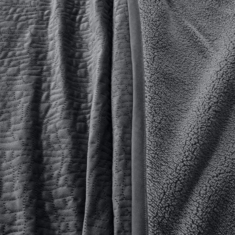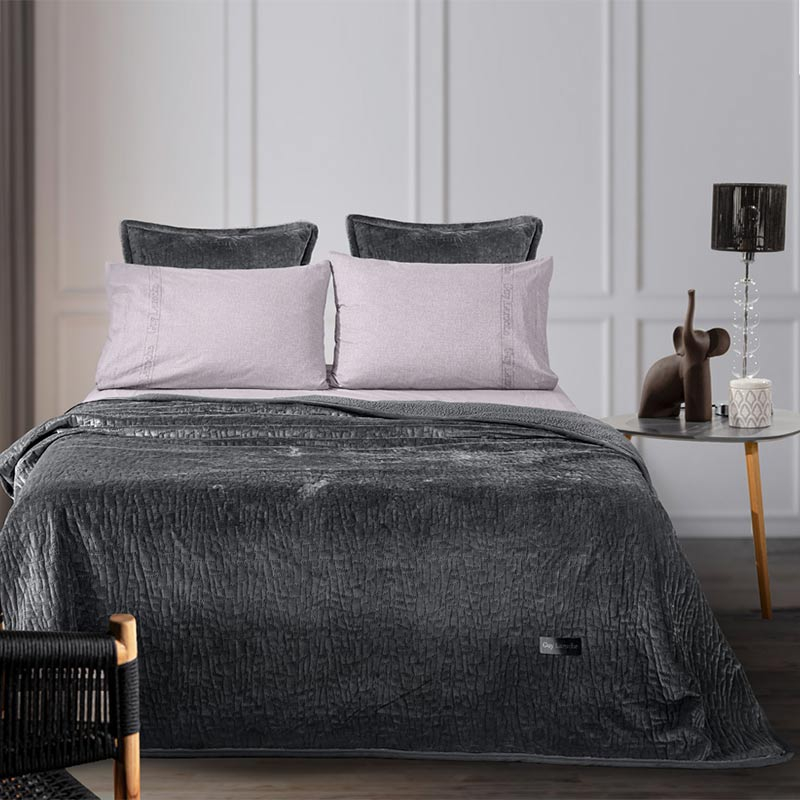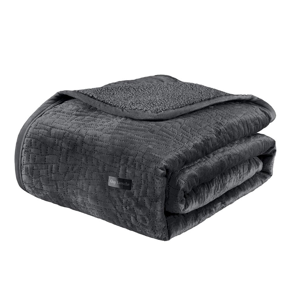Μονό κουβερλί με γουνάκι από την εταιρεία Guy Laroche σε ανθρακί χρώμα και ανάγλυφο σχέδιο. Είναι κατασκευασμένο από 100% velvet polyester με την μία μεριά να έχει πολύ απαλή υφή και η άλλη μεριά να είναι γουνάκι sherpa. Περιλαμβάνεται η διακοσμητική μαξιλαροθήκη με περιμετρικό πλαίσιο (τύπος Oxford). Ιδανικό σκέπασμα για τους φθινοπωρινούς και ανοιξιάτικους μήνες.