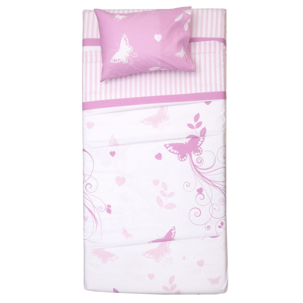 Κουβερλί ημίδιπλο σετ σε λευκό-ροζ χρώμα και σχέδιο πεταλούδες από την εταιρία Viopros. Η εξωτερική του σύνθεση είναι από 100% βαμβάκι 145 κλωστών και η γέμιση από πολυεστερική βάτα. Ιδανικό ανοιξιάτικο σκέπασμα. Στο σετ περιλαμβάνεται η μαξιλαροθήκη με το σχέδιο του πανωσέντονου.