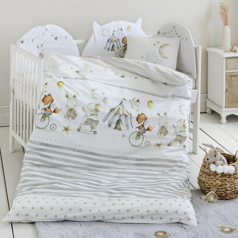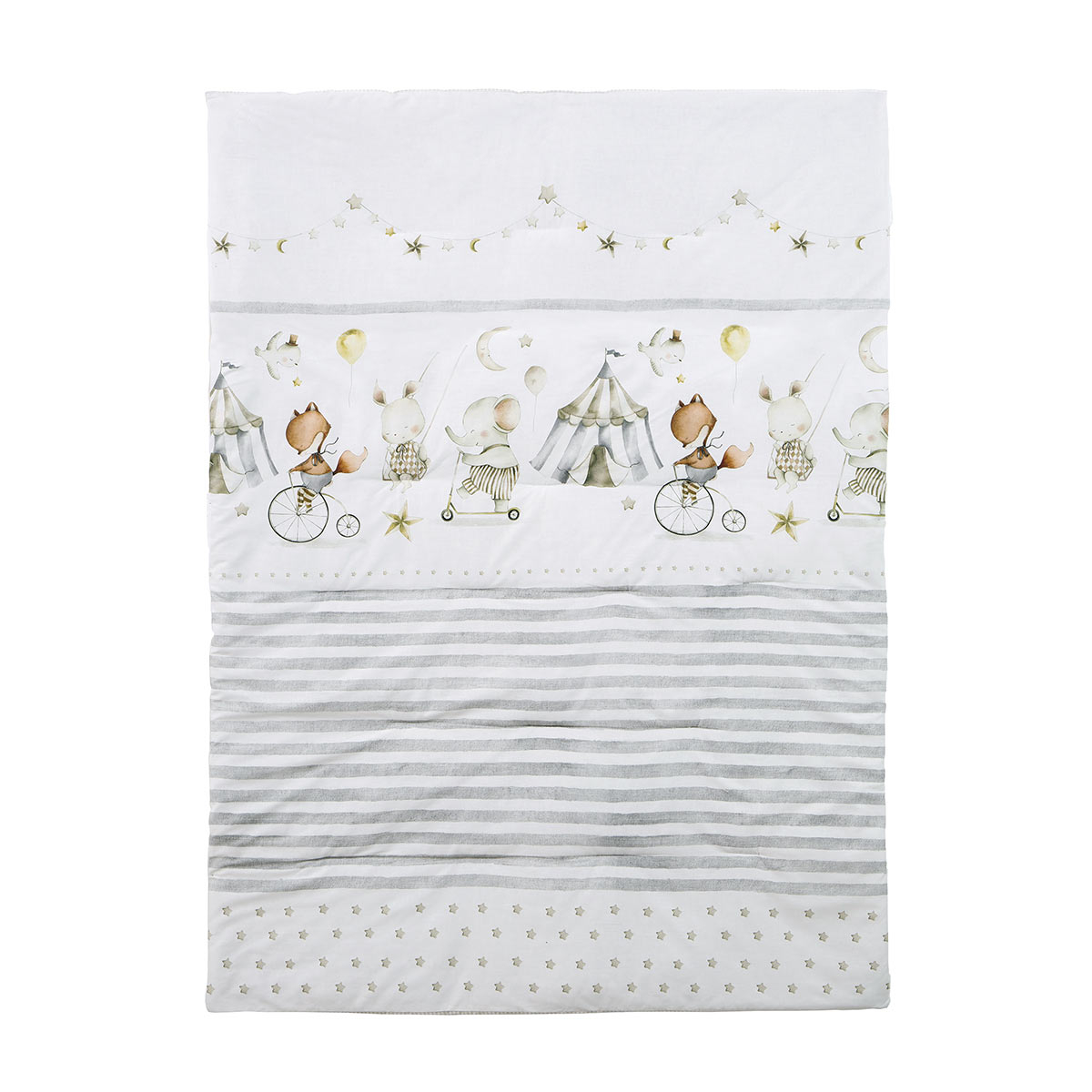 Βρεφικό κουβερλί για την κούνια από την εταιρεία Nima. Σε εκρού χρώμα με γκρι-πολύχρωμες λεπτομέρειες και σχέδιο με ζωάκια. Το εξωτερικό ύφασμα είναι 100% βαμβάκι 144 κλωστών, που προσφέρει απαλή υφή και ανθεκτικότητα. Εσωτερικά έχει λεπτή πολυεστερική βάτα, που το καθιστά ιδανικό σκέπασμα για τους ανοιξιάτικους και καλοκαιρινούς μήνες. Είναι διπλής όψης, η μία μεριά έχει το σχέδιο του πανωσέντονου και η άλλη το σχέδιο του κατωσέντονου. Συνδυάστε το με τα υπόλοιπα είδη της ίδιας σειράς για ένα ολοκληρωμένο αποτέλεσμα.