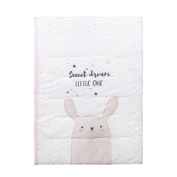 Βρεφικό κουβερλί για την κούνια από την εταιρεία Nima. Σε εκρού-ροζ χρώμα με γκρι λεπτομέρειες και σχέδιο λαγουδάκι. Το εξωτερικό ύφασμα είναι 100% βαμβάκι 144 κλωστών, που προσφέρει απαλή υφή και ανθεκτικότητα. Εσωτερικά έχει λεπτή πολυεστερική βάτα, που το καθιστά ιδανικό σκέπασμα για τους ανοιξιάτικους και καλοκαιρινούς μήνες. Είναι διπλής όψης, η μία μεριά έχει το σχέδιο του πανωσέντονου και η άλλη το σχέδιο του κατωσέντονου. Συνδυάστε το με τα υπόλοιπα είδη της ίδιας σειράς για ένα ολοκληρωμένο αποτέλεσμα.